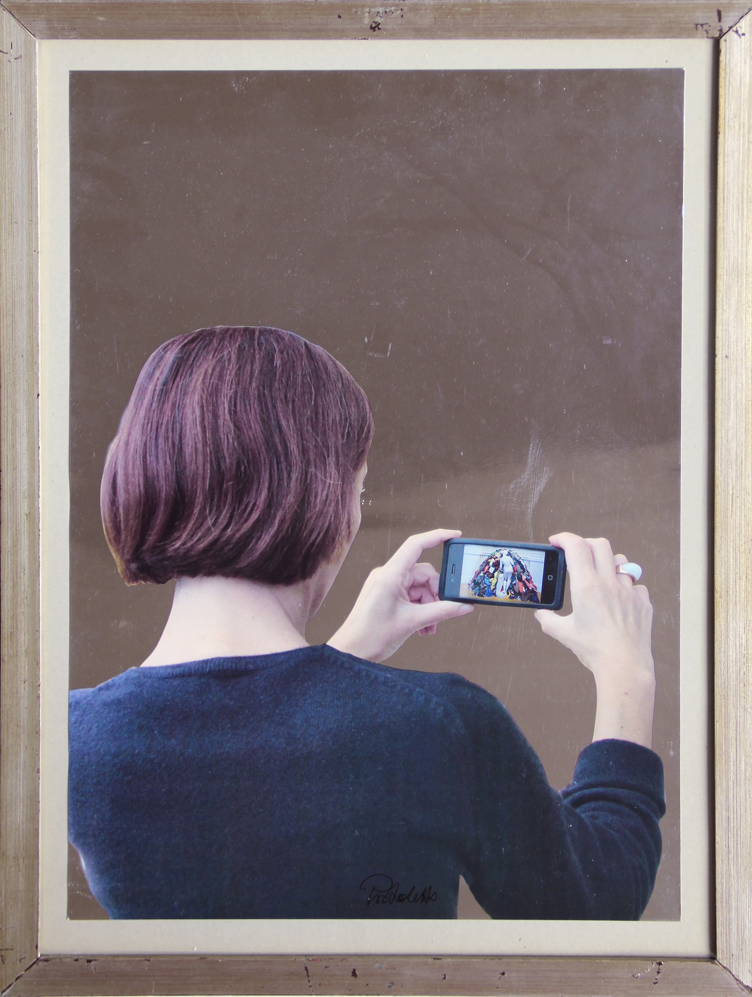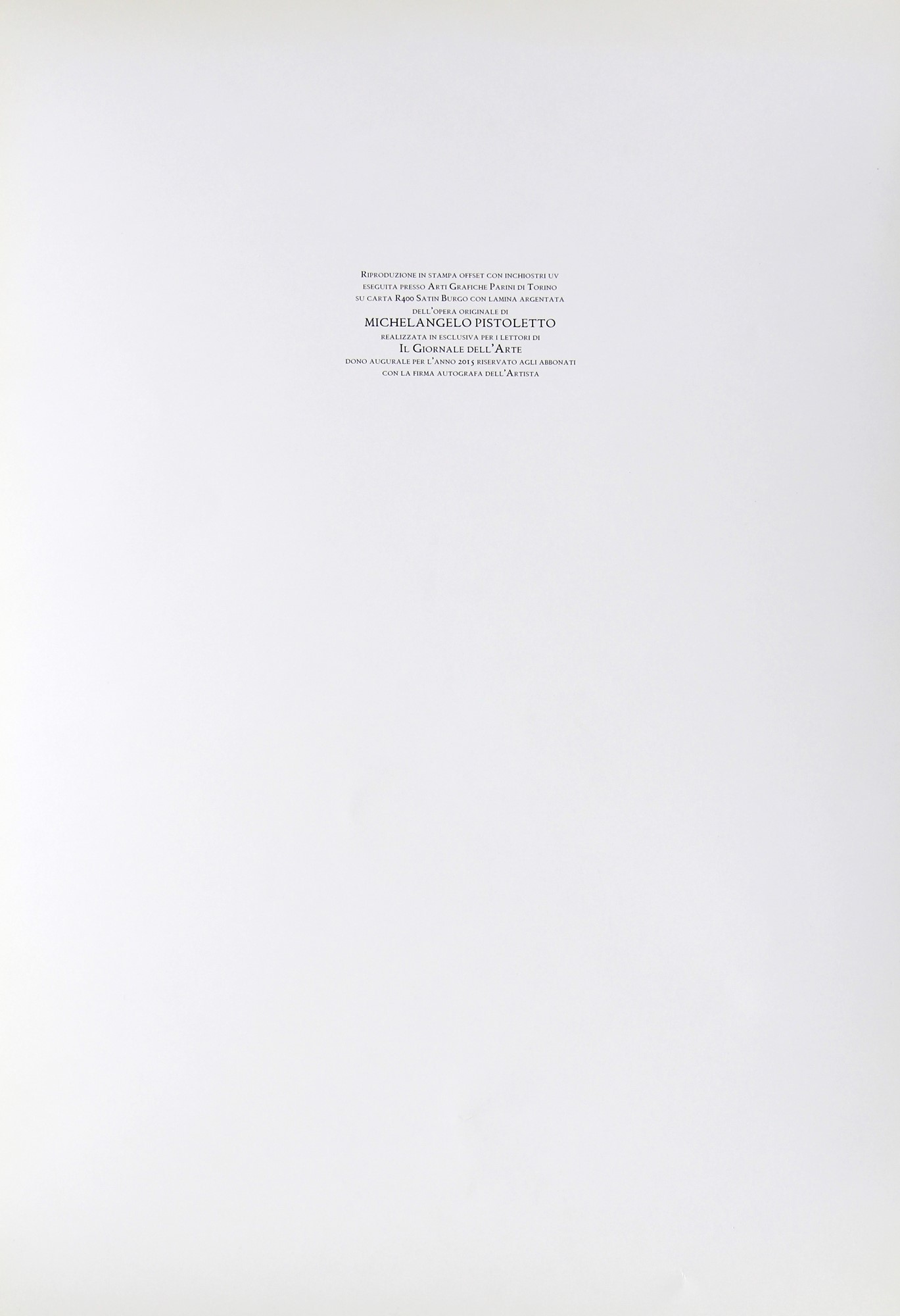 PISTOLETTO Michelangelo, Senza titolo (donna che fotografa la Venere degli stracci), 2015, stampa offset con inchiostri uv su carta R400 Satin Burgo con lamina argentata, cm 64x44