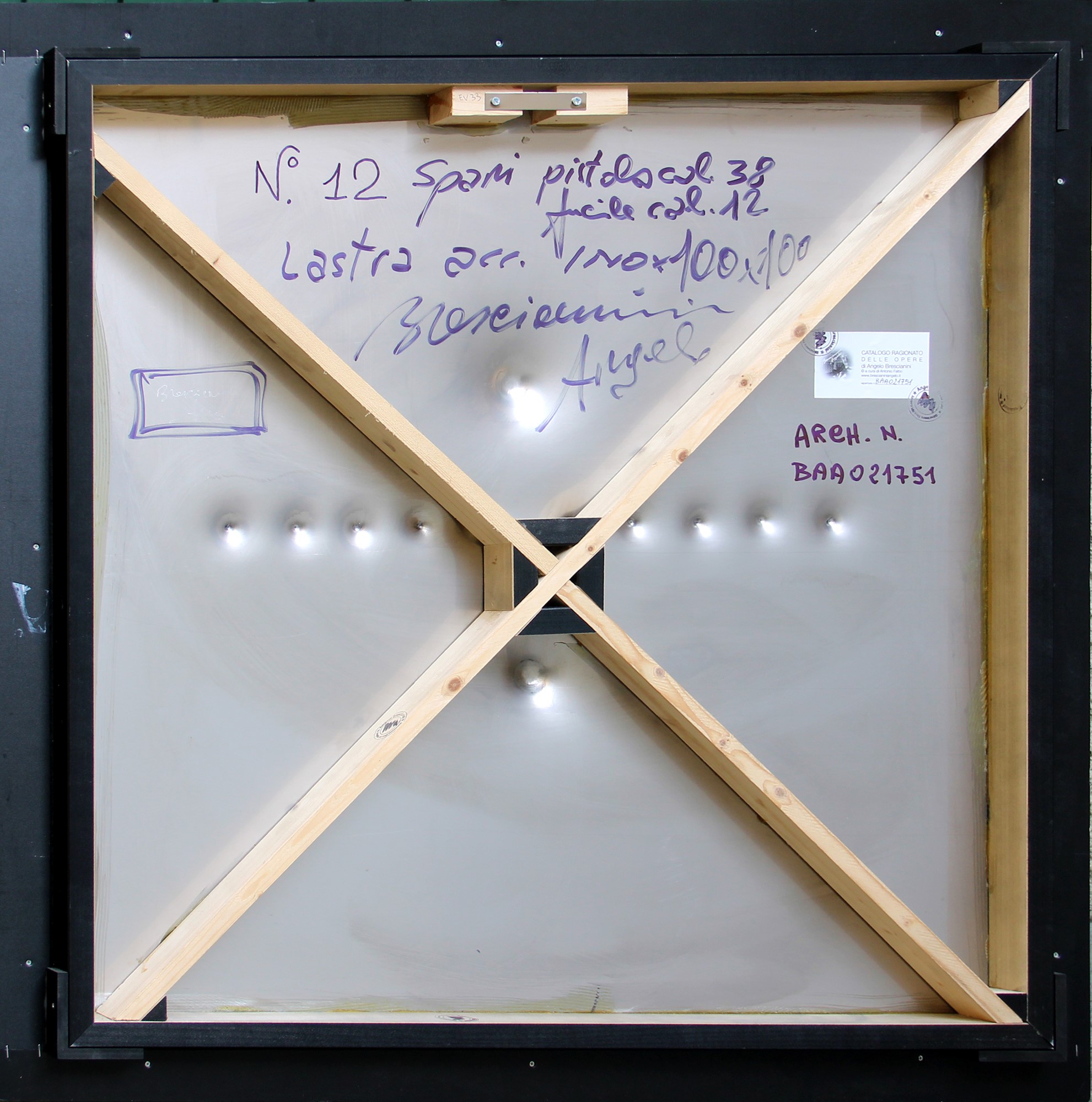 Tecnica, misura, firma, numerazione, titolo "N. 12 spari pistola cal. 38 fucile cal. 12, lastra acc. inox, 100x100, Brescianini Angelo, arch. n. BAA021751";