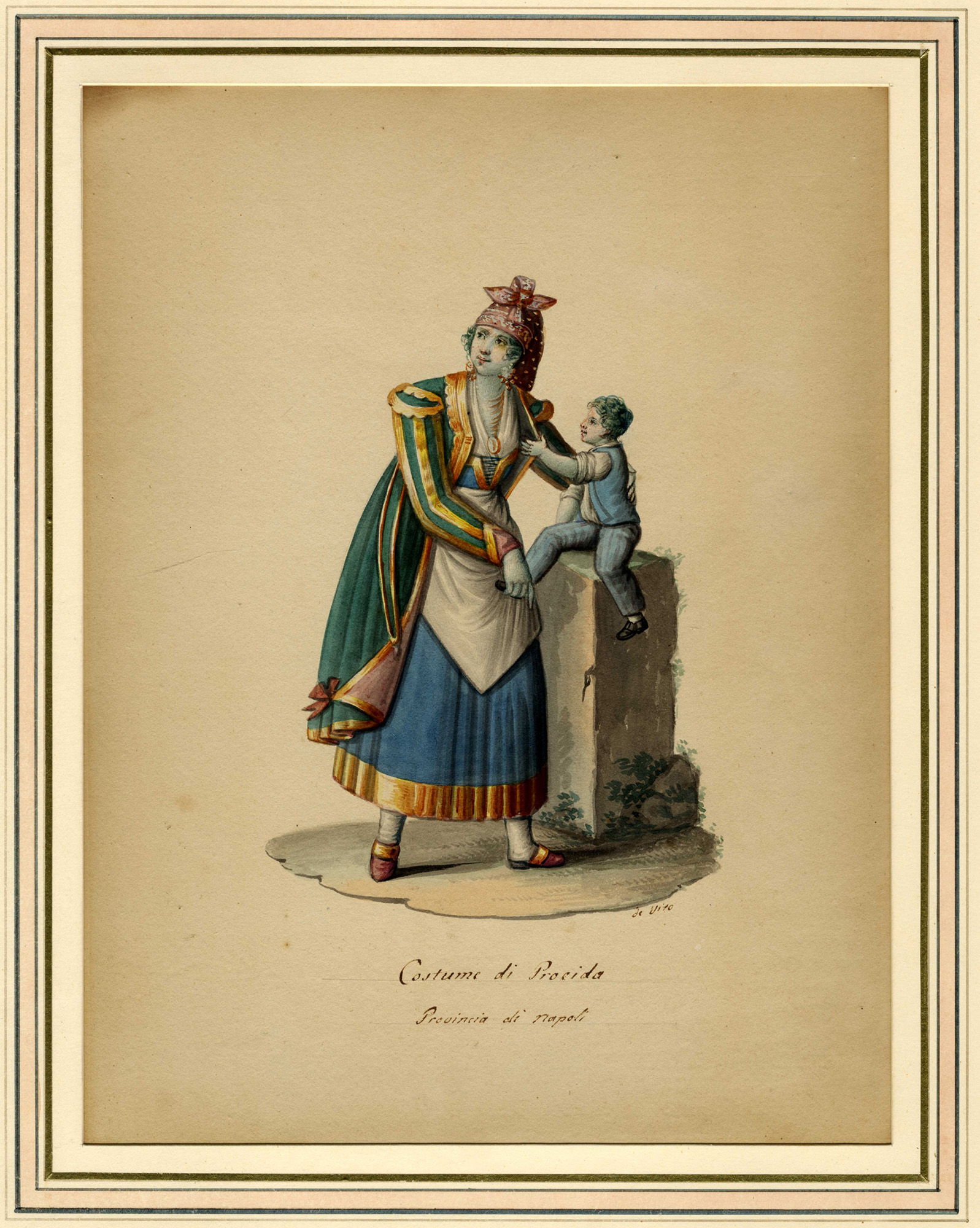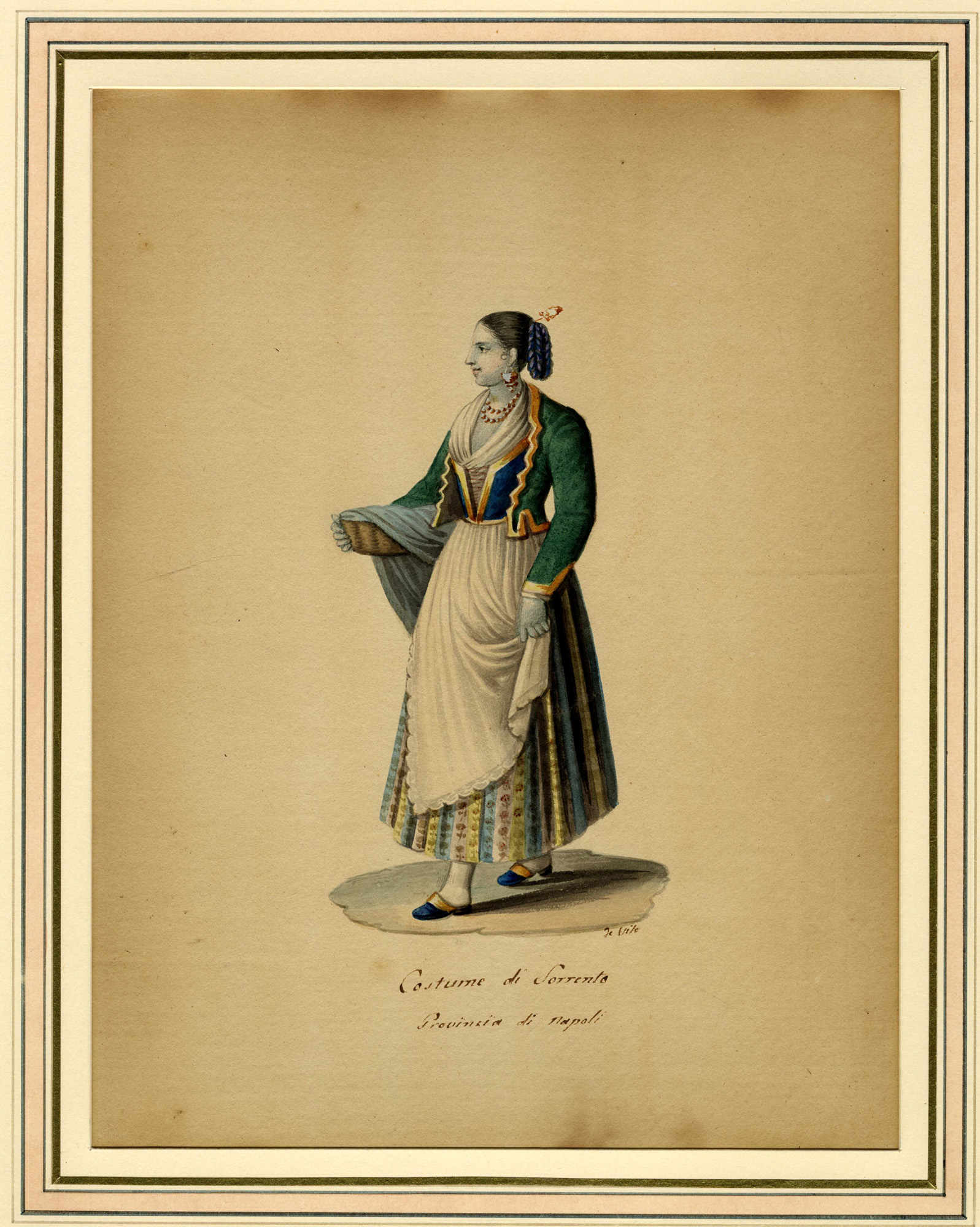 Ognuno recante firma e descrizione della figura ritratta a penna e inchiostro di china bruno sulla parte inferiore della figura. Compongono il lotto: Costume Napolitano del borgo di Chiaja, Costume di Sorrento Provincia di Napoli, Costume Napolitano del basso volgo, Costume di Carafagreci Provincia di Calabria nel Regno di Napoli e Costume di Procida Provincia di Napoli.