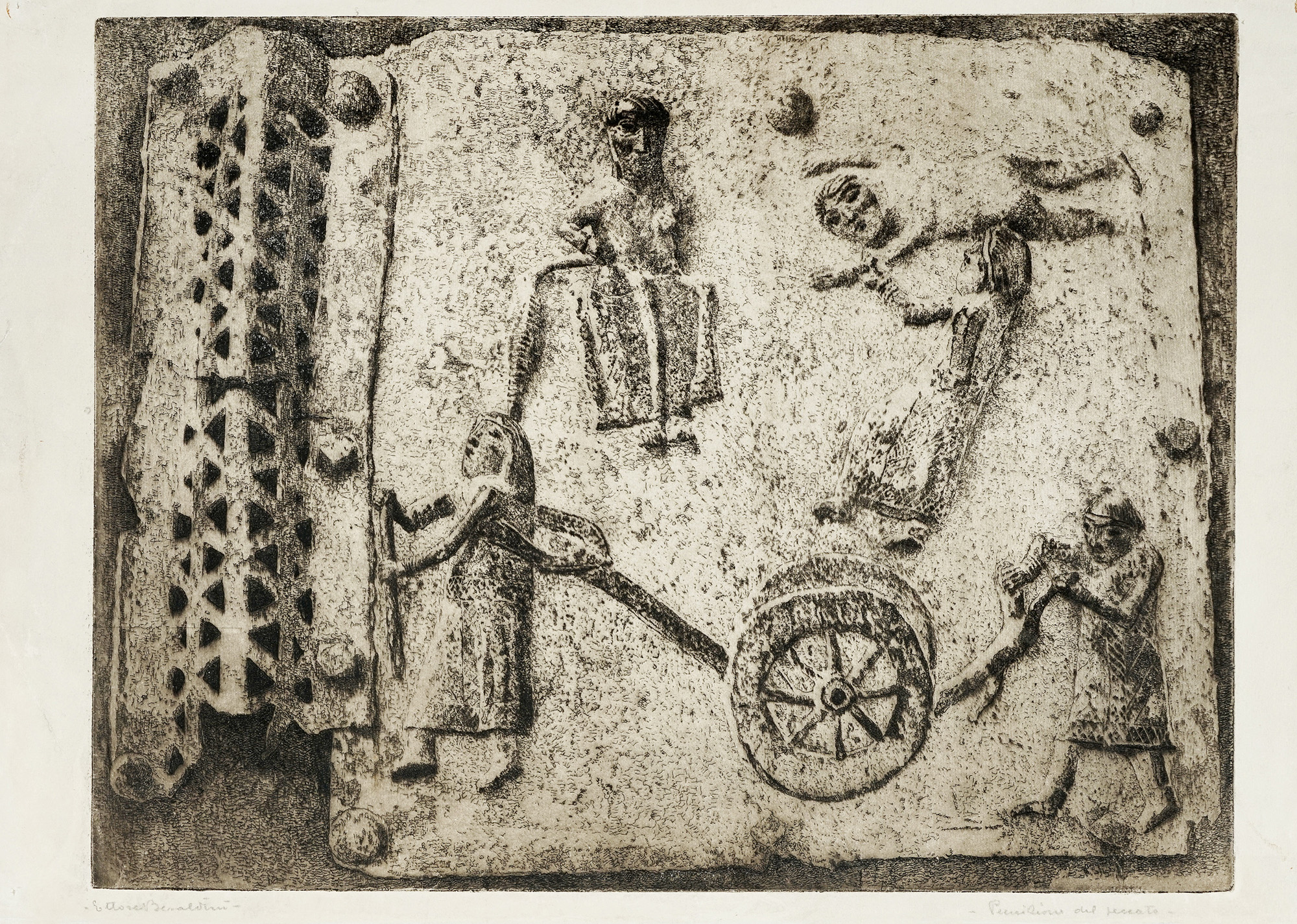 1) Punizione del senato. Acquaforte. mm 320x420. Foglio: mm 345x490. Firmata a matita in basso a sinistra, titolata a matita in basso a destra.