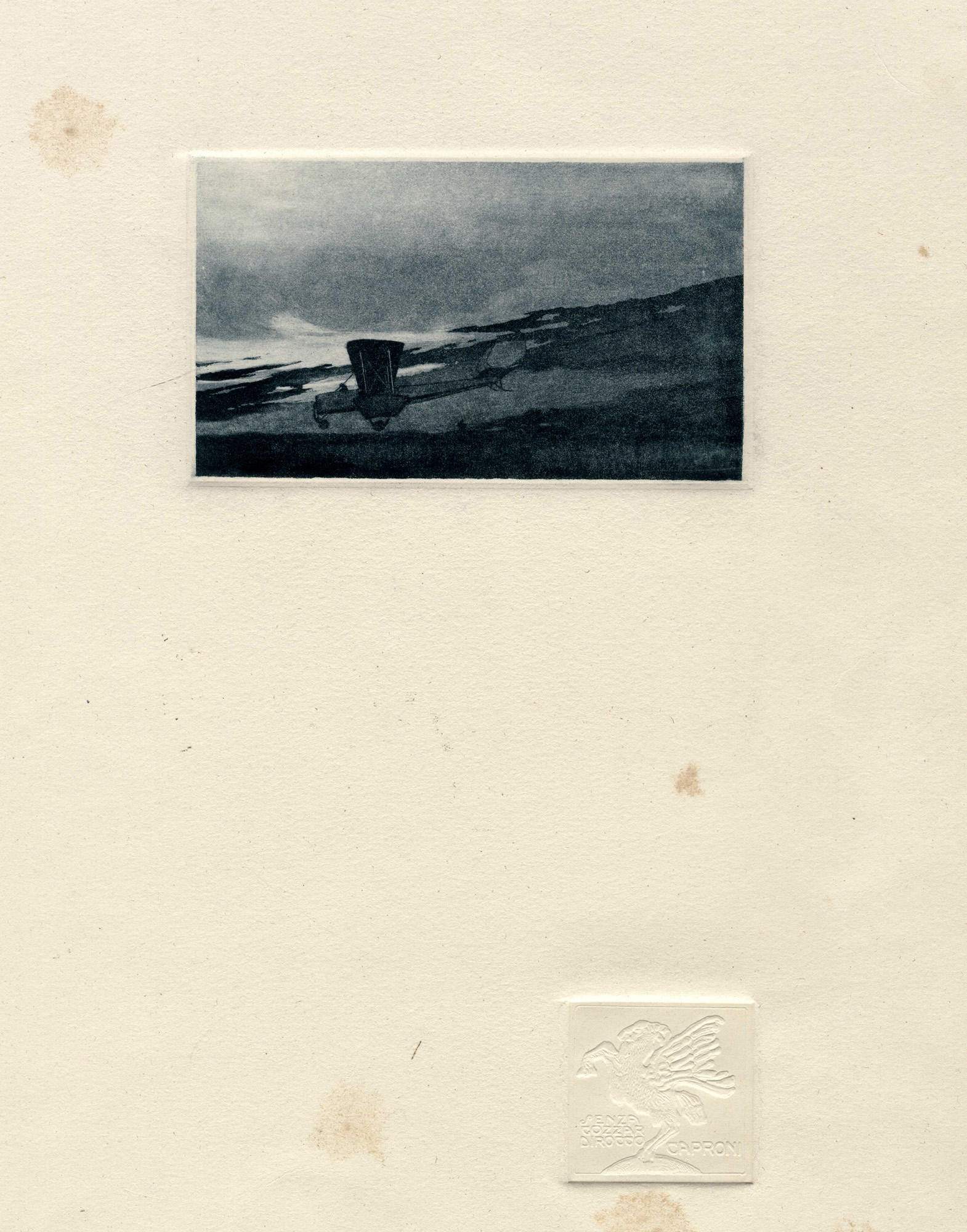 Raccolta di 3 acquetinte raffiguranti aeroplani Caproni in volo