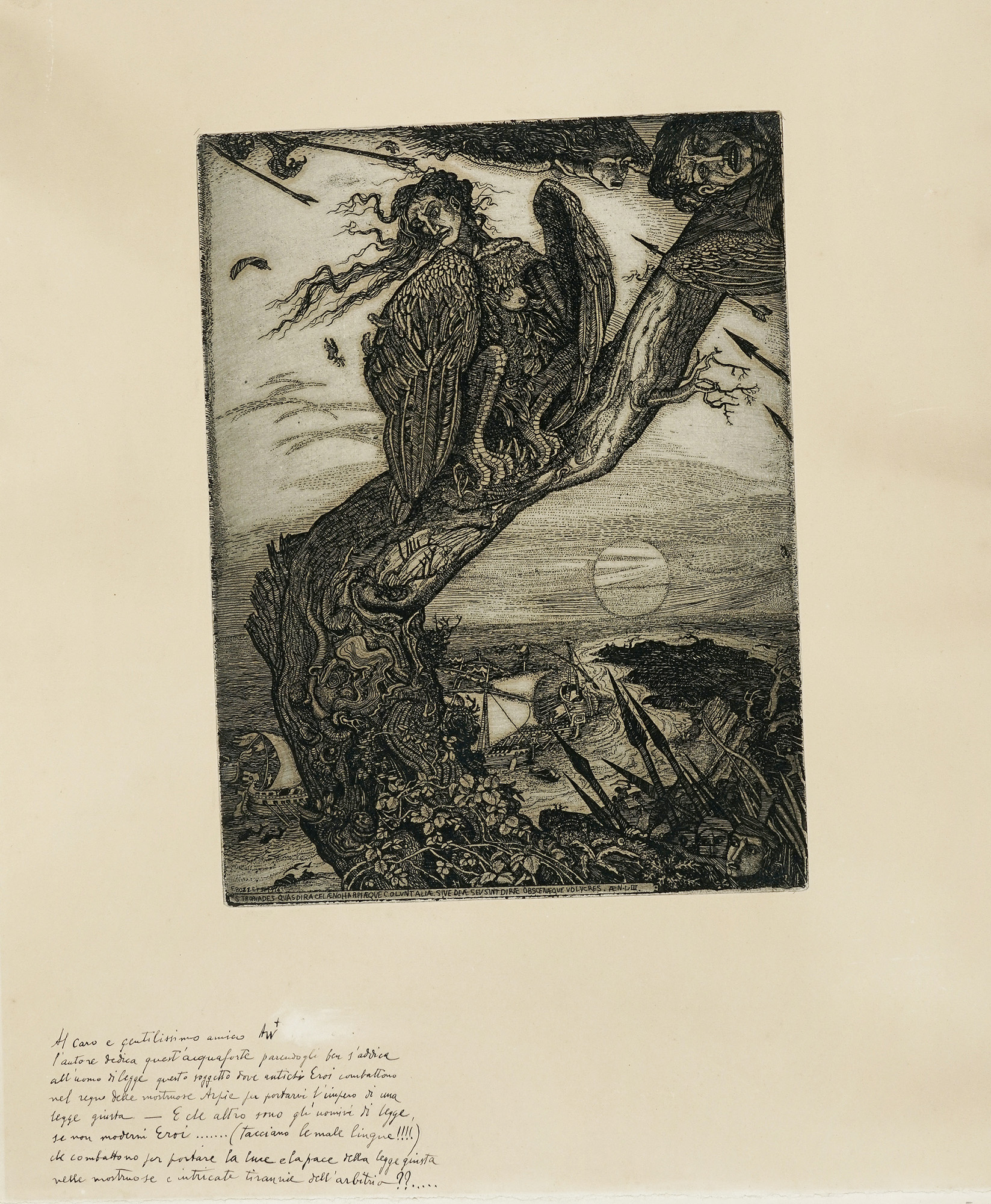 Dedica manoscritta a penna e inchiostro di china all'angolo inferiore sinistro del foglio.