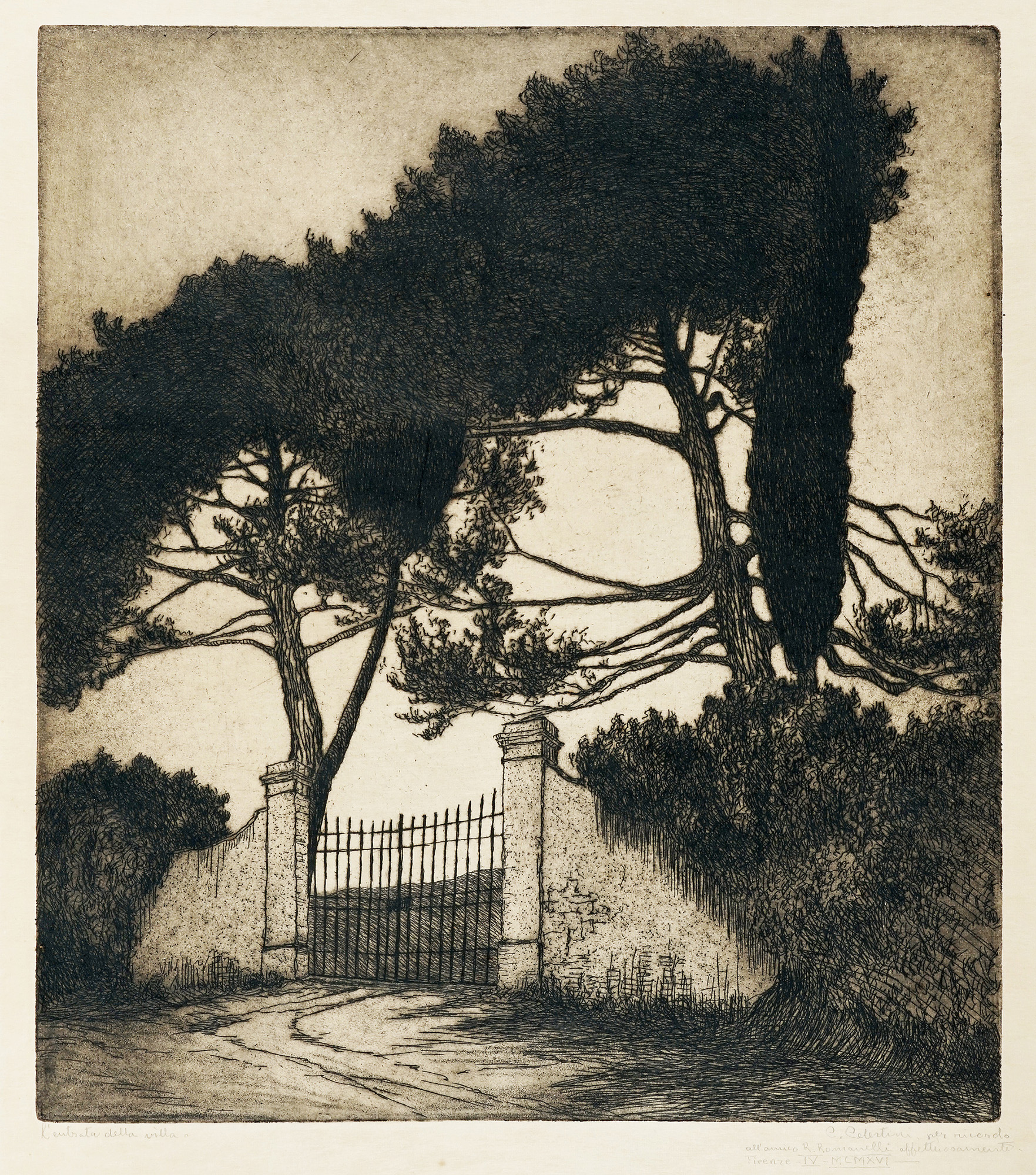 2) L'entrata della villa. 1926. Acquaforte. mm 330x295. Foglio: mm 442x400. Titolata a matita in basso a sinistra. Firmata e dedicata a R. Romanelli a matita in basso a destra.