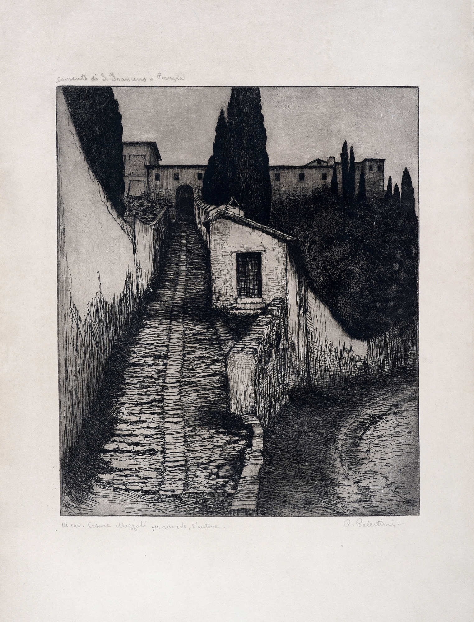 1) Convento di S. Francesco a Perugia. Acquaforte. mm 310x260. Foglio: mm 470x348. Titolata a matita in alto a sinistra, firmata a matita in basso a destra. Dedica a Cesare Mazzoli a matita in basso a sinistra.