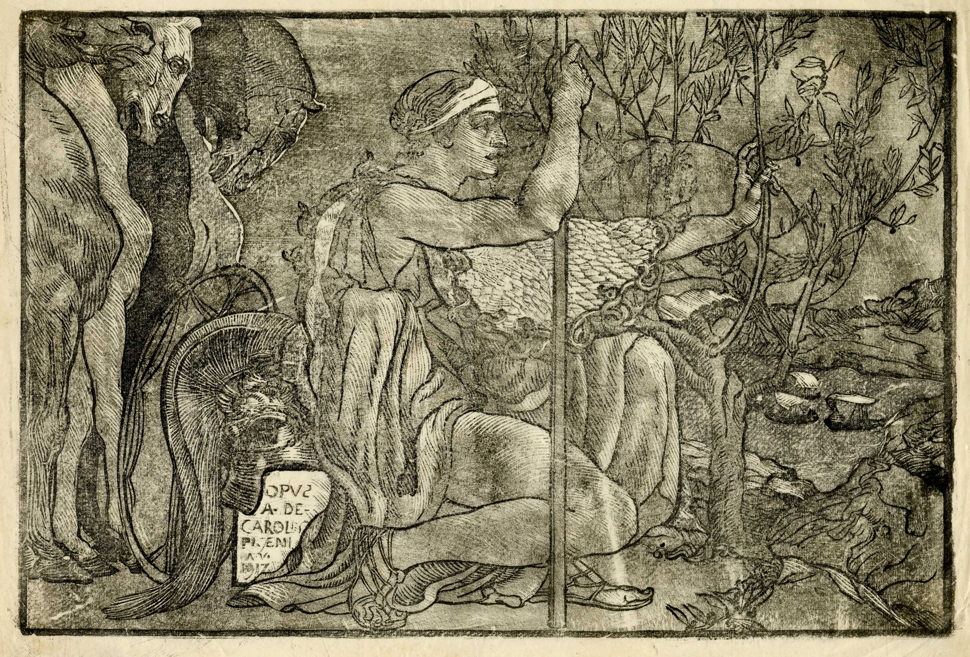 La xilografia ripete il soggetto di una delle vele per il Salone del Podestà di Bologna, con la rappresentazione del Regno Vegetale.