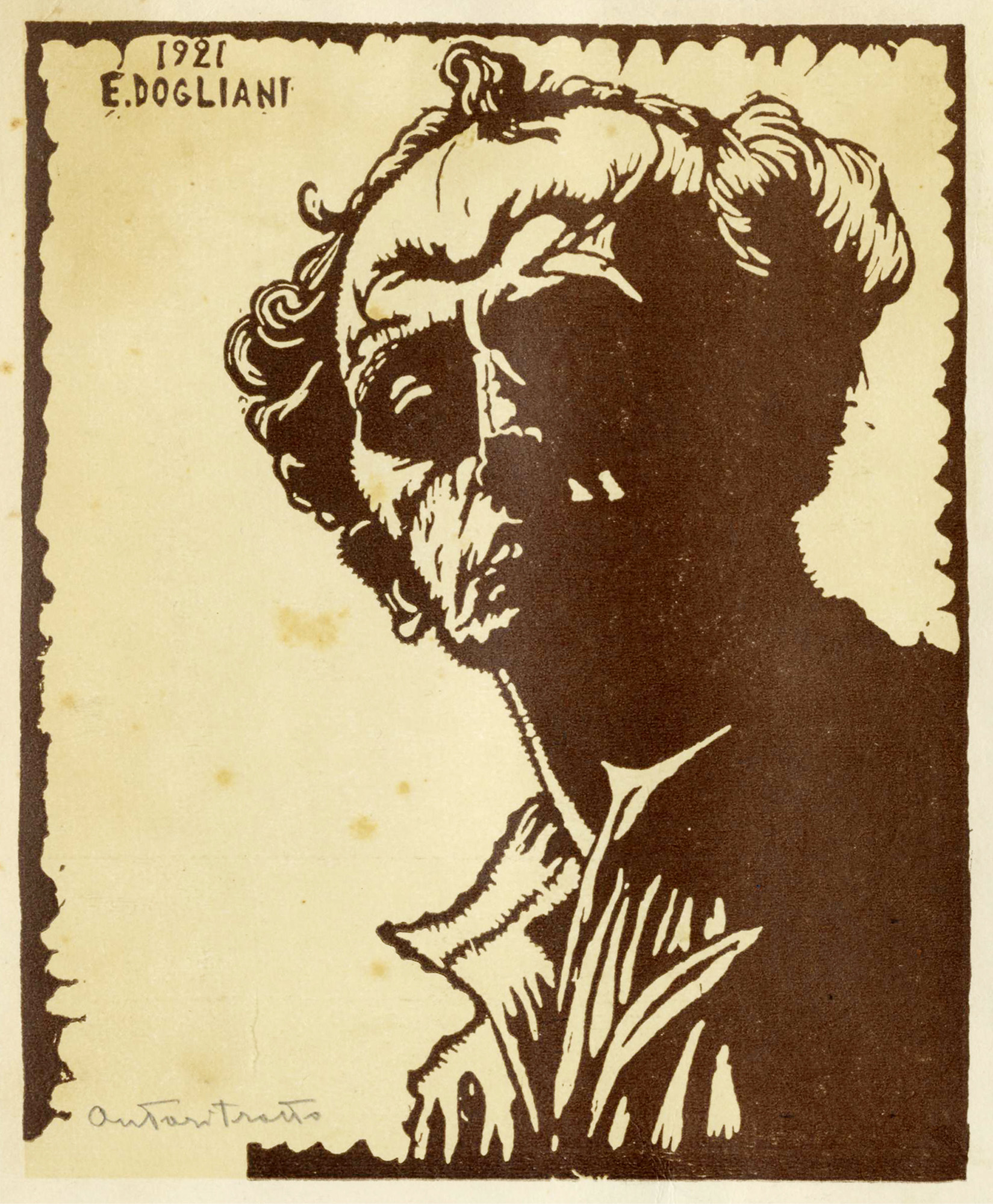 Firmata a penna e inchiostro di china bruno in basso a destra. Al verso del supporto: Dogliani E., Autoritratto. 1921. Xilografia. mm 145x120. Foglio: mm 158x130. Firma e data in lastra in alto a sinistra. Titolata a matita in basso a sinistra.