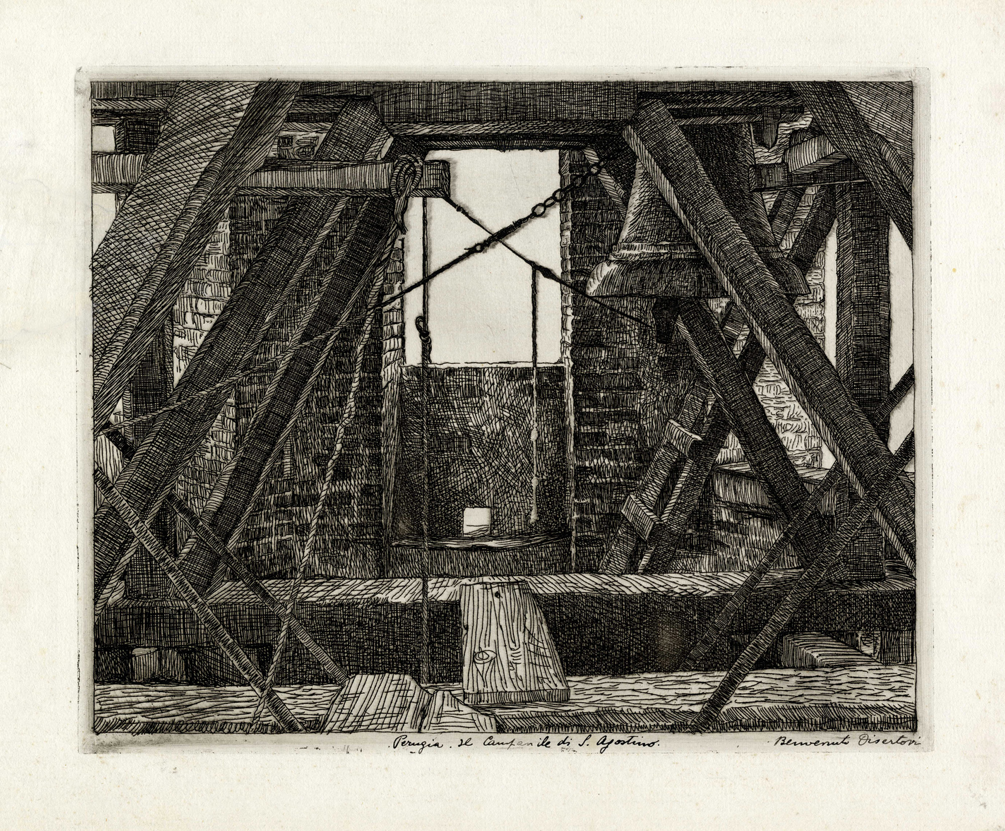 2) Campanile Sant'Agostino a Perugia. 1919. Acquaforte su carta vergellata. mm 240x300. Foglio: mm 307x410.