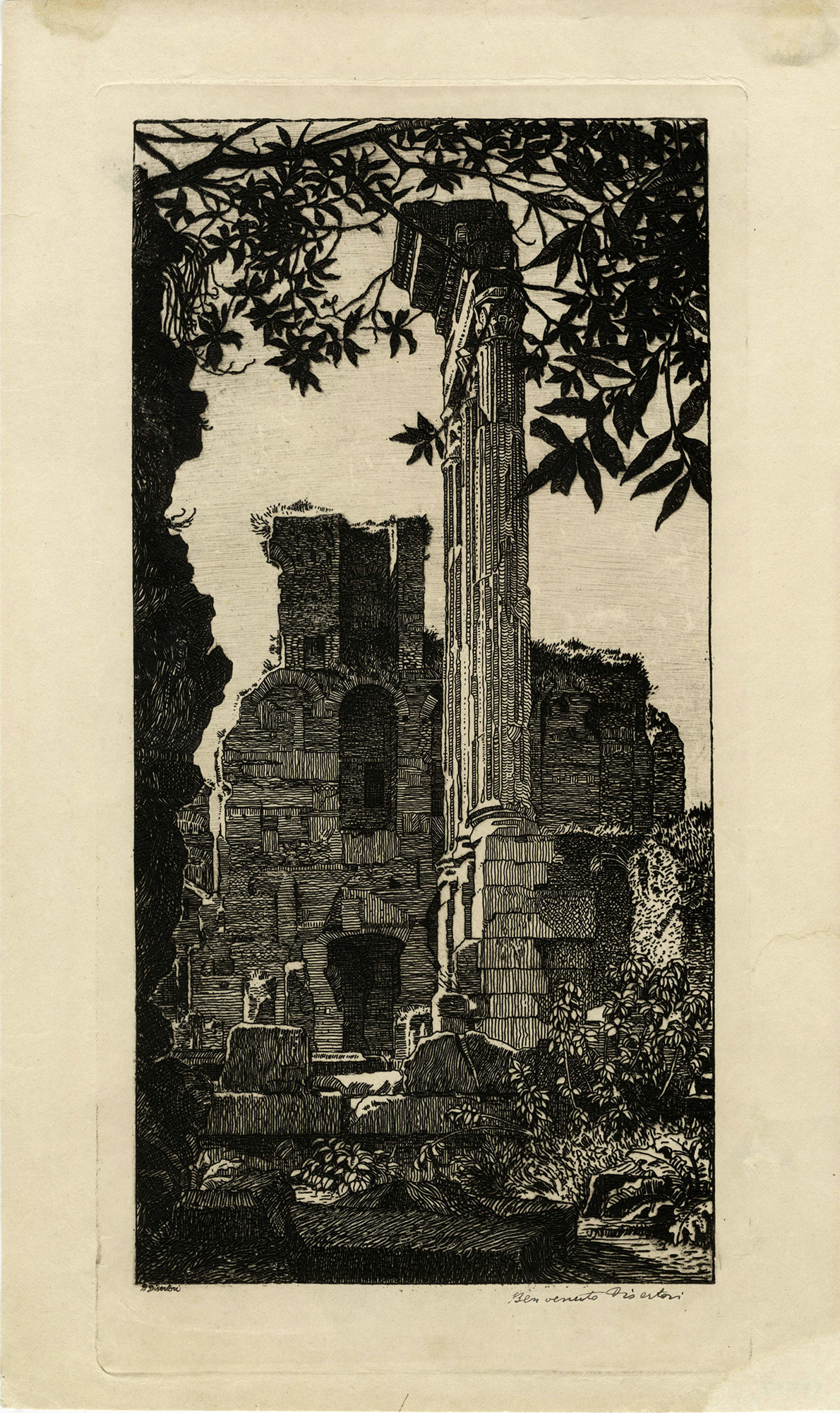 1) Il tempio dei dioscuri. 1918-19. Acquaforte. mm 315x160. Foglio: mm 380x230.