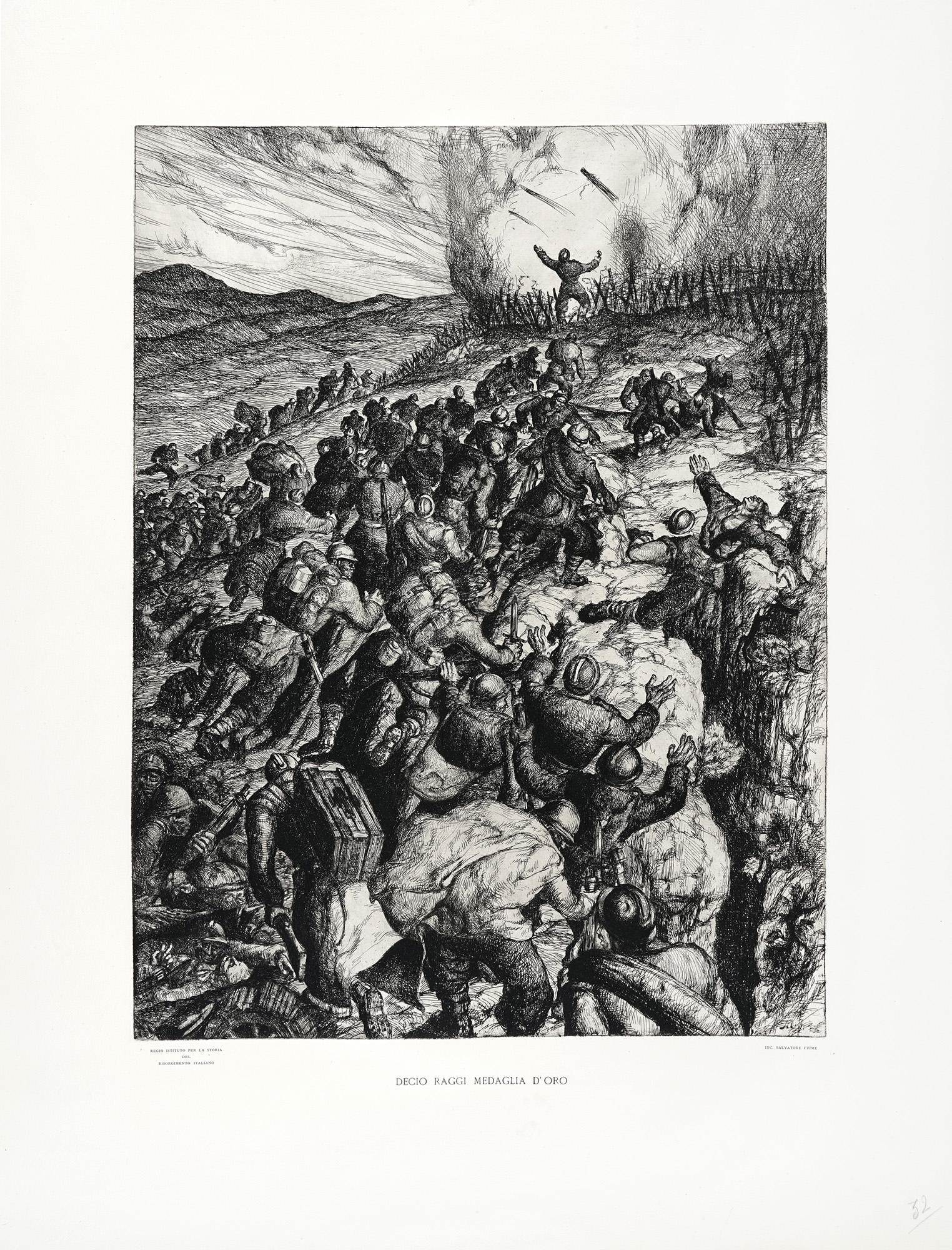 Opera proveniente dalla cartella Medaglie d'oro al valor militare. L'oro e l'inchiostro. Incisori italiani tra le due guerre nel "Concorso della regina", a cura di Francesco Parisi e Massimiliano Vittori, catalogo della mostra, Cagliari 2004, Latina, Novecento, 2004, p. 55.