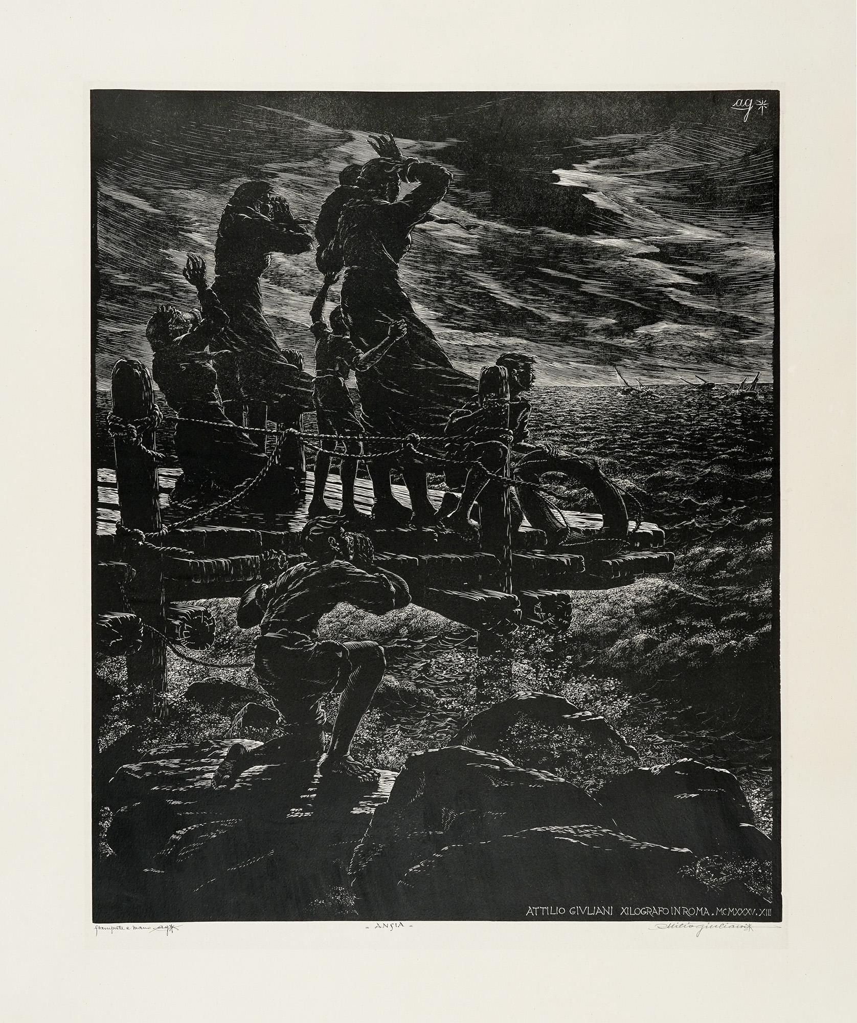 Siglata in lastra all'angolo superiore destro, iscrizione "ATTILIO GIVLIANI XILOGRAFO IN ROMA. MCMXXXV. XIII" in lastra all'angolo inferiore destro. Firmata a matita in basso a destra, titolata a penna e inchiostro di china nero in basso al centro. Iscritto: "Stampata a mano" con ulteriore sigla d'artista a penna e inchiostro di china nera in basso a sinistra. Controfirma ed iscrizione a matita "Silografia in Roma al Viale delle Medaglie d'oro 190" al verso del supporto.