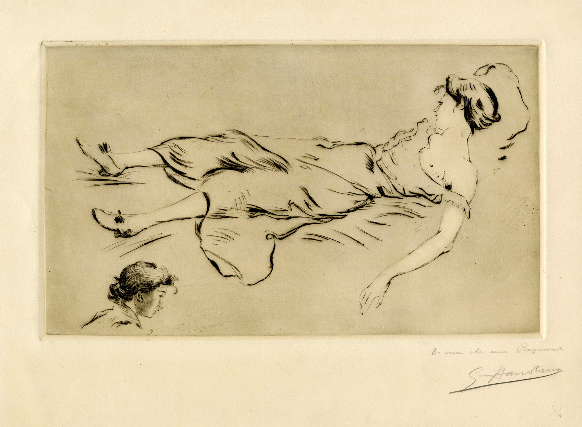 2) Anonimo del XIX secolo. Dama distesa. Acquaforte. mm 190x330. Foglio: mm 325x510.