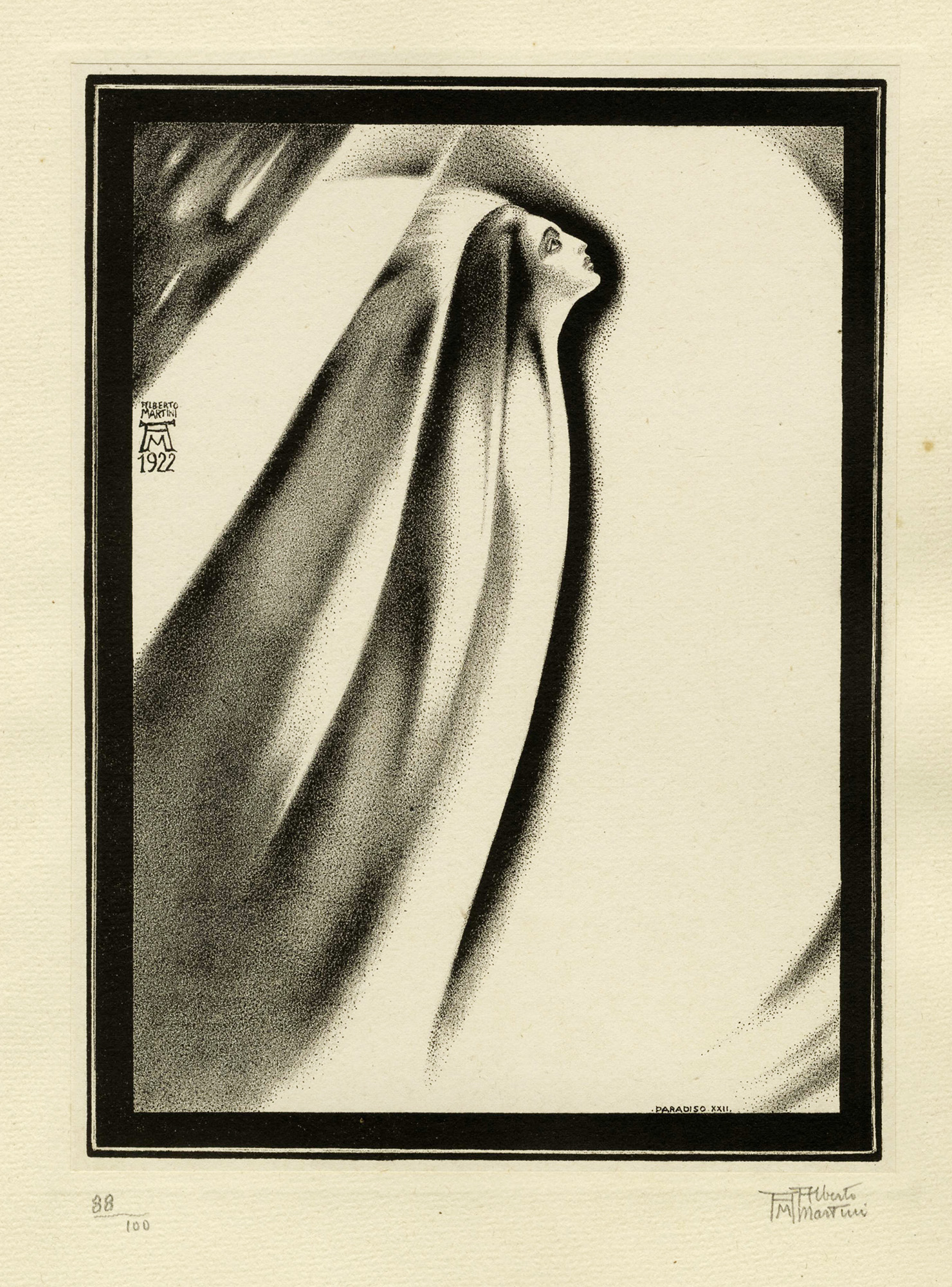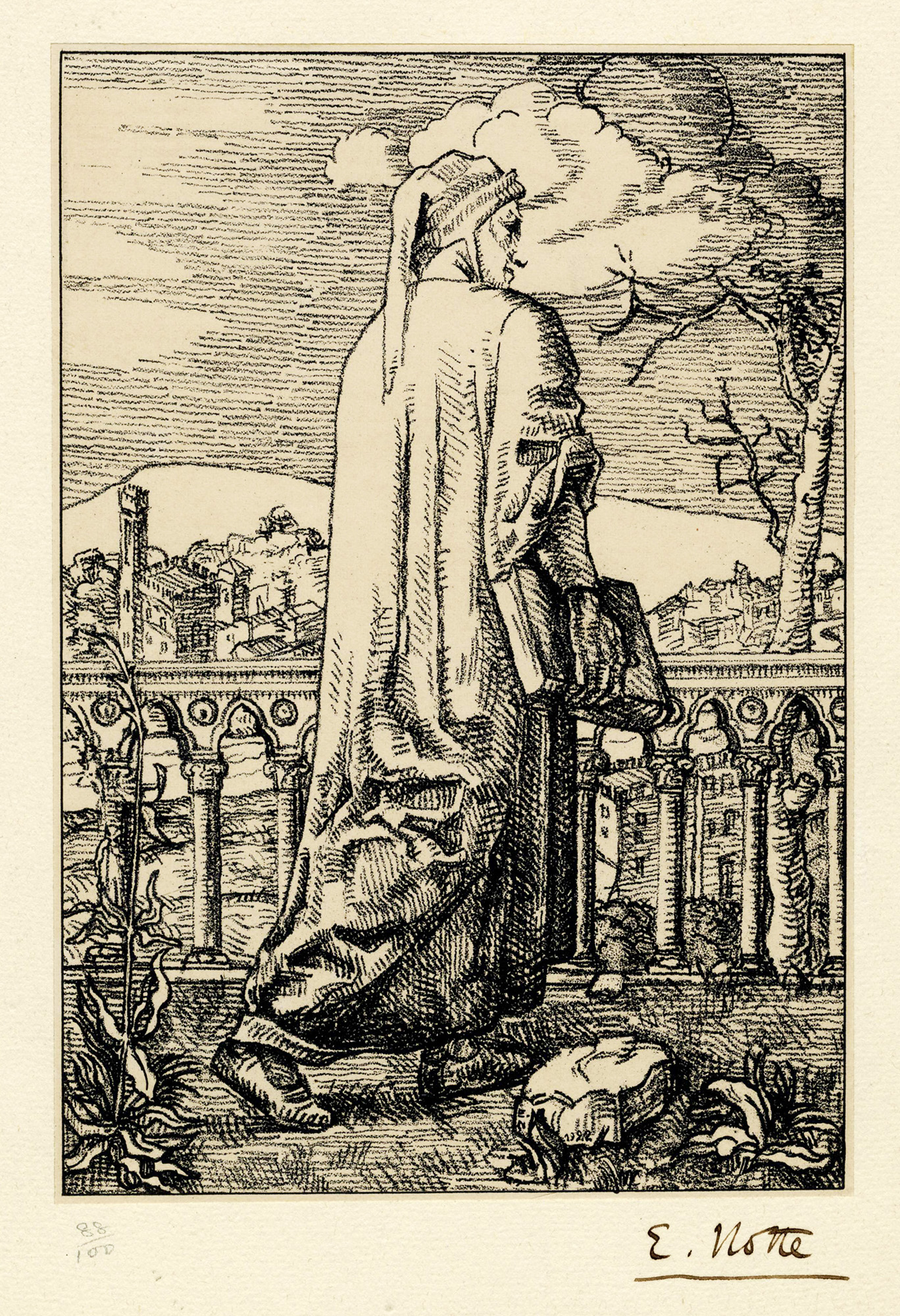 Illustrazioni per: Alighieri D., La Divina Commedia novamente illustrata da artisti italiani. Firenze: Giorgio&Piero Alinari, 1922, di cui si unisce il bifolio contenente il frontespizio e l'occhietto. SI AGGIUNGE: Notte E., Dante Alighieri. Litografia su velina applicata su cartoncino. mm 205x140. Foglio: mm 310x245. Firmata a penna e inchiostro di china bruno in basso a destra. Litografia destinata insieme alle tre di Alberto Martini alla tiratura di testa di 100 esemplari della Divina Commedia a cura di V. Alinari (Firenze: Alinari, 1922).