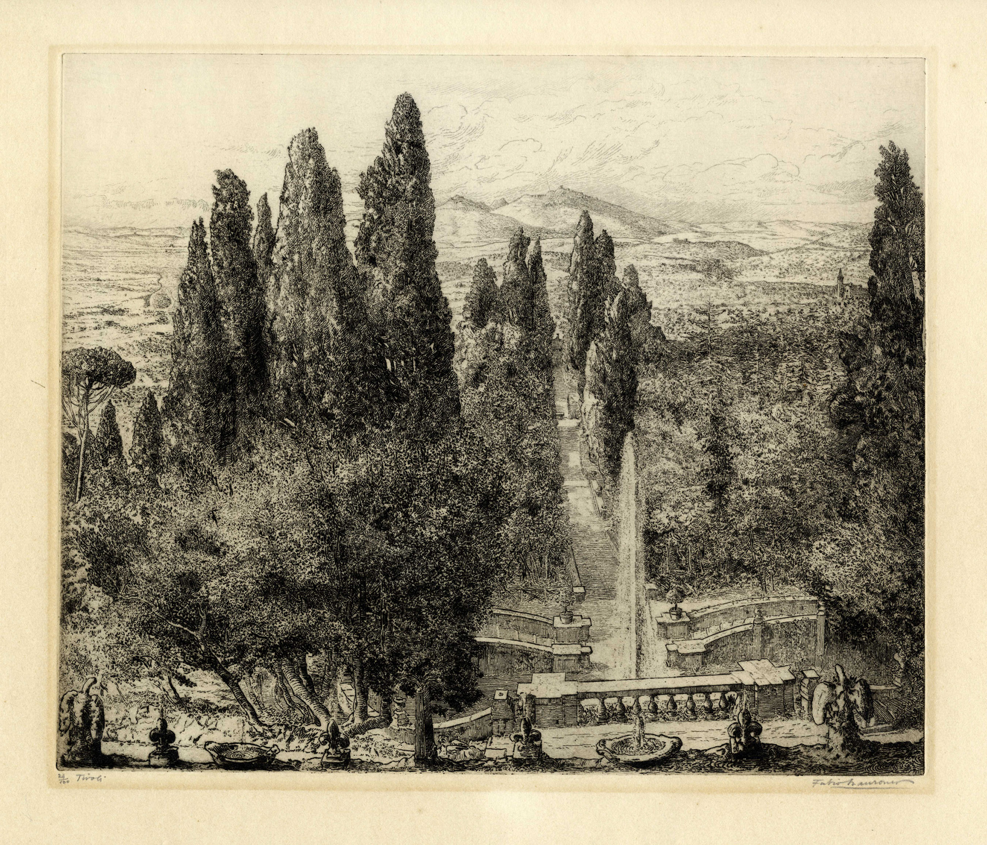 2) Tivoli. 1927. Acquaforte su carta vergellata. mm 250x300. Foglio: mm 388x445.