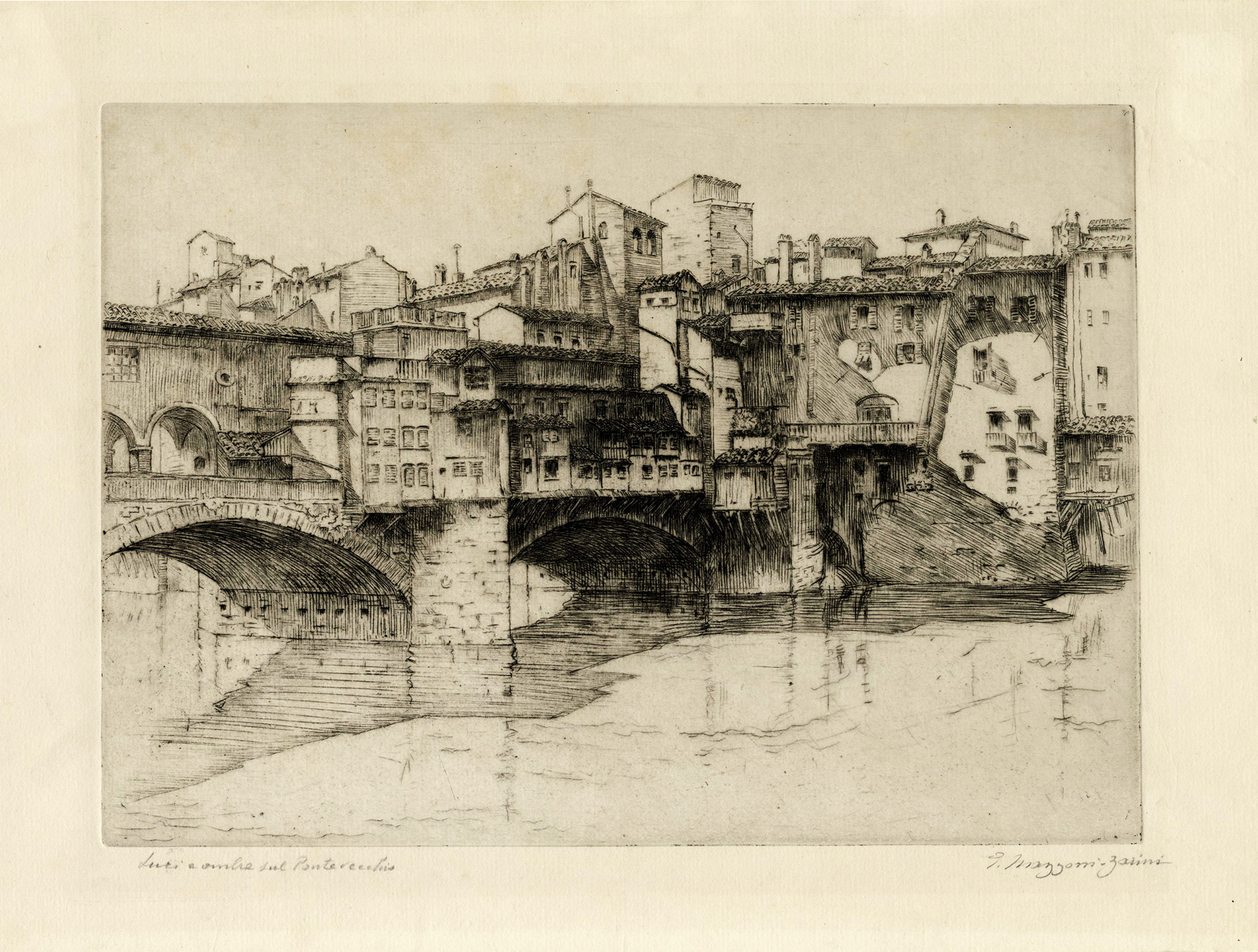 2) Luci e ombre sul Pontevecchio. Acquaforte su carta vergellata con filigrana. mm 200x276. Foglio: mm 260x360.