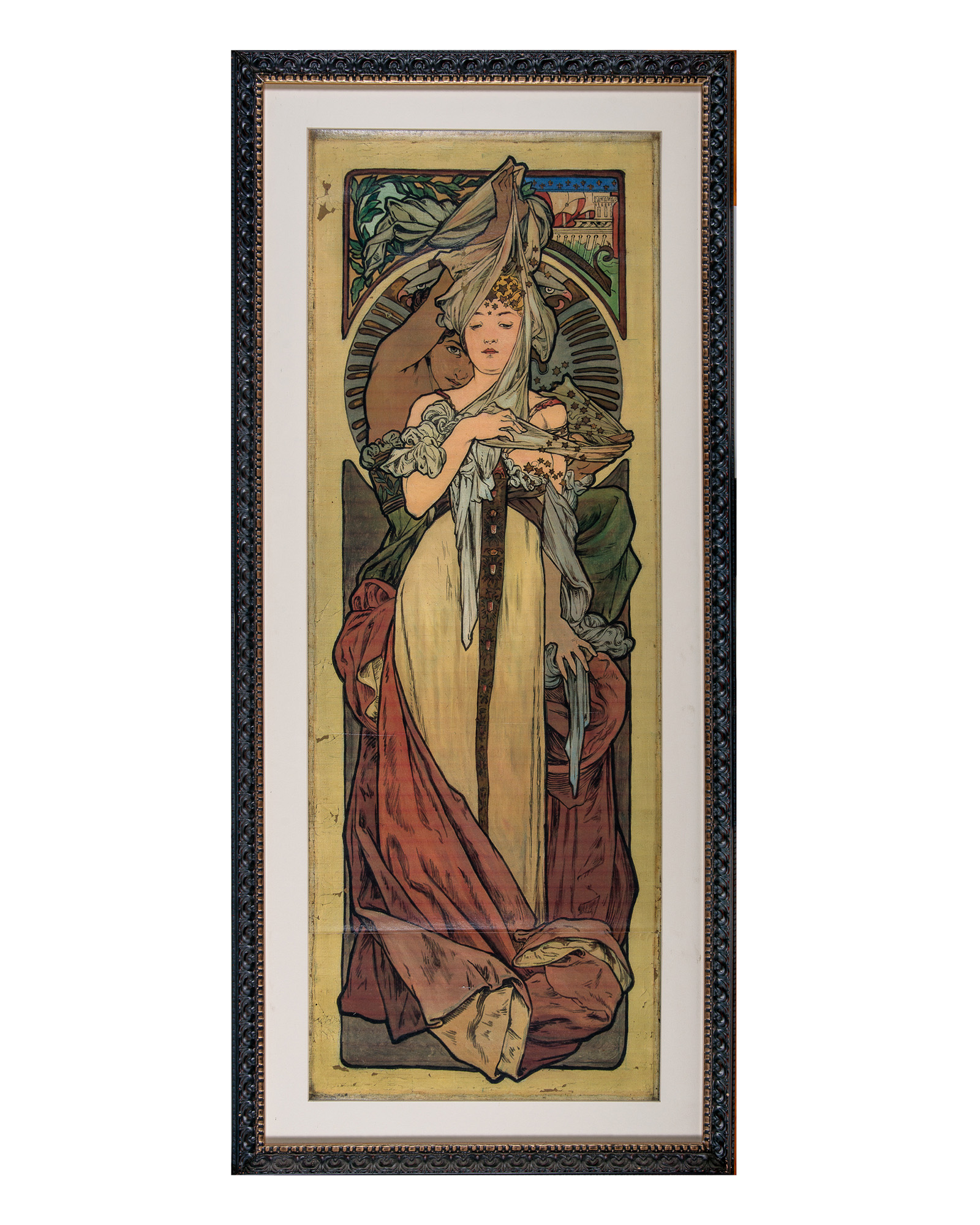 L'immagine corrisponde alla parte sinistra del manifesto Österreich auf der Weltasstellung Paris 1900 eseguito dall'artista ceco attivo a Parigi per pubblicizzare il padiglione austriaco all'Esposizione Universale del 1900. Tuttavia questa stampa, che riteniamo essere d'epoca, differisce non solo per le dimensioni più grandi ma anche per numerosi dettagli, prima di tutto all'angolo superiore sinistro dove le foglie di alloro non formano il cerchio con le lettere presente nel manifesto e per l'assenza della firma in basso a sinistra, come se l'immagine fosse stata poi modificata in fase di traduzione litografica. Potrebbe trattarsi forse di un modello preparatorio la cui riproduzione evidenzia anche alcune abrasioni o altri difetti della carta presenti nei margini. Si tratterebbe quindi di un documento di notevole rarità. Pubblicato in La vergine e la femme fatale. L'eterno femminino nell'immaginario grafico del Simbolismo e dell'Art Nouveau, a cura di Emanuele Bardazzi, catalogo della mostra, Sesto Fiorentino 26 marzo-28 maggio 2017, Firenze, Polistampa, 2017, p. 168, n. 234.