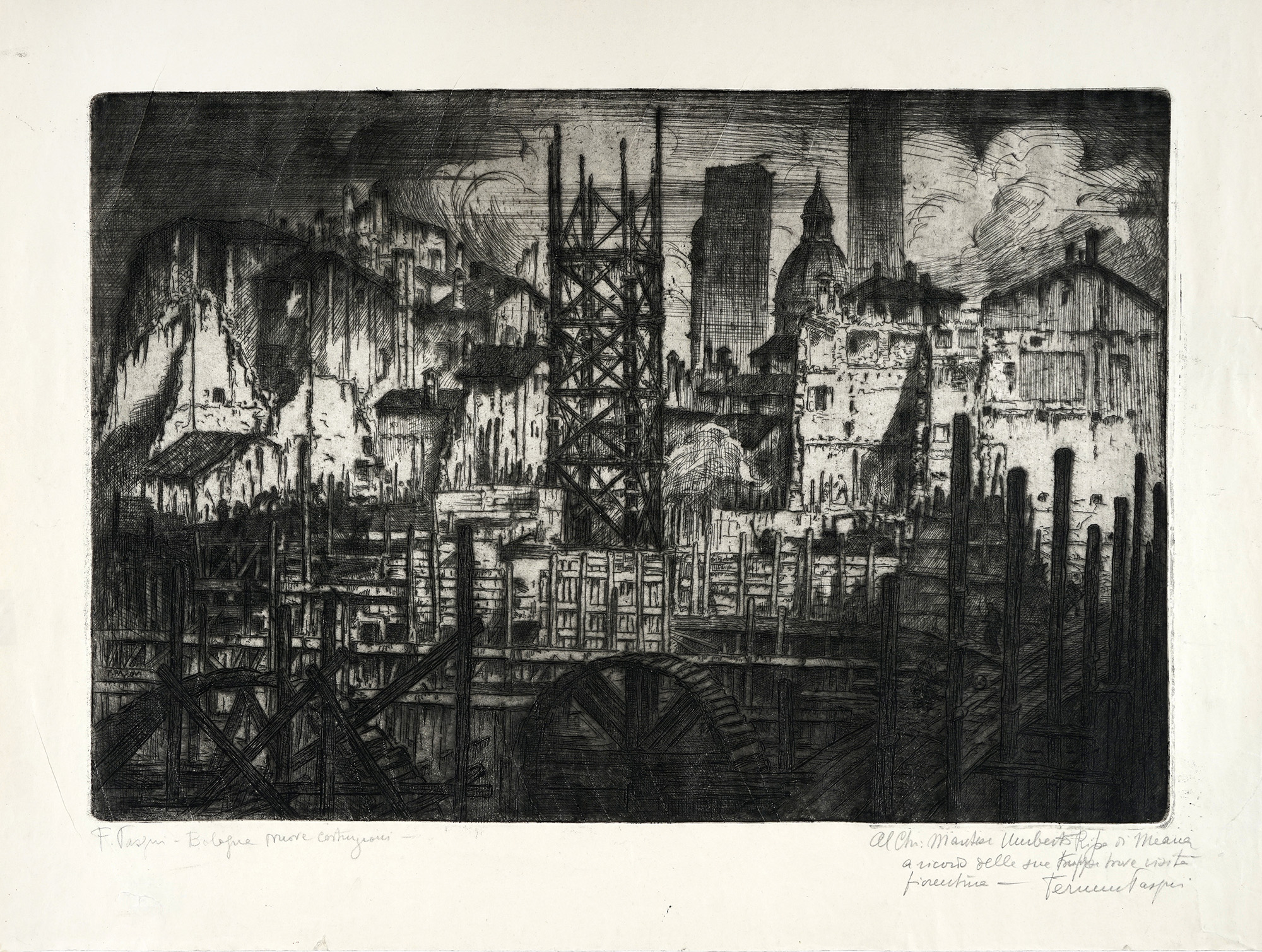1) Ferruccio Pasqui, Bologna Nuove Costruzioni. 1935 ca. Acquaforte. mm 390x575. Foglio: mm 527x710.