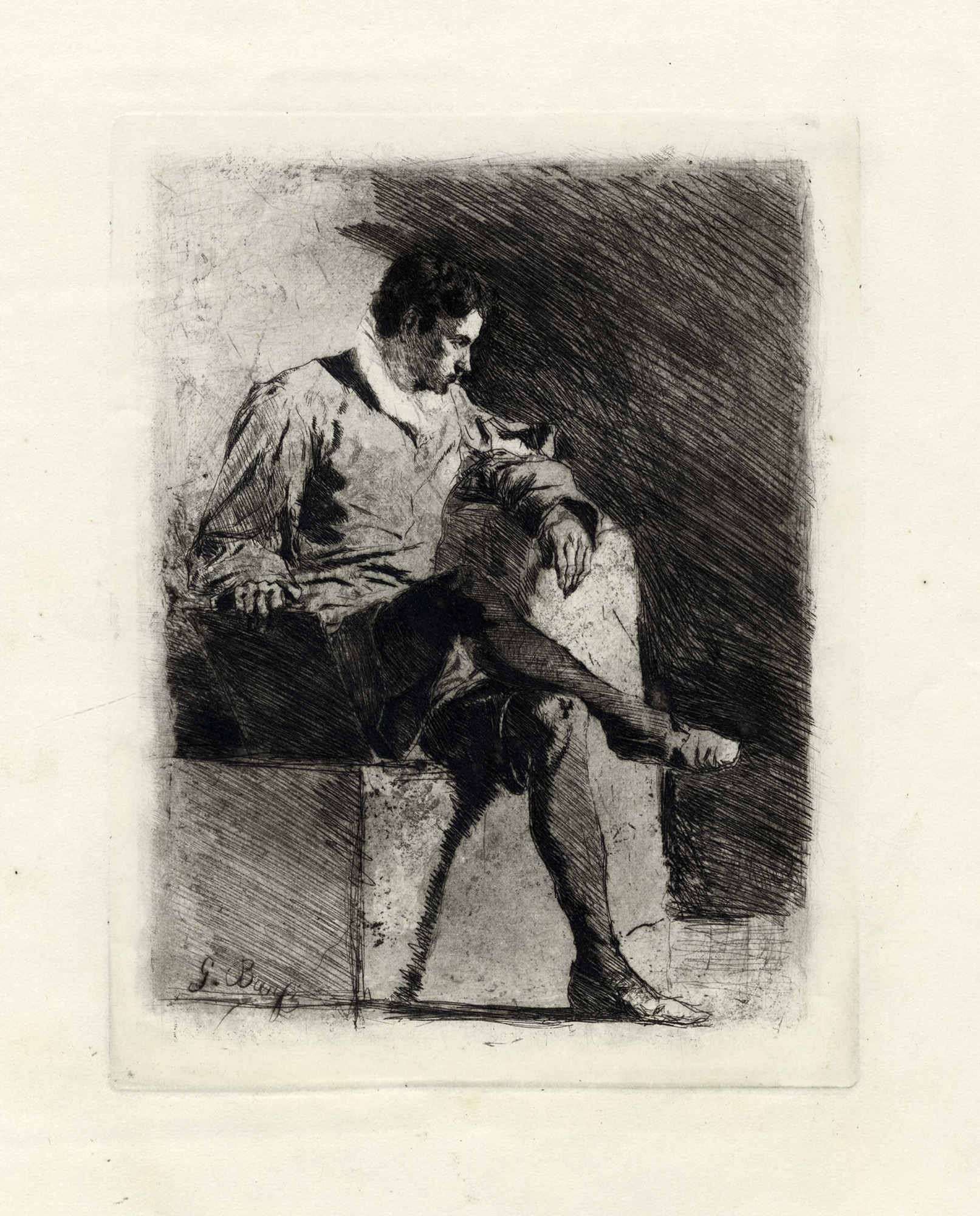 2) Banfi G., Uomo seduto. Ante 1878. Acquaforte. 190x150. Foglio: mm 435x290.