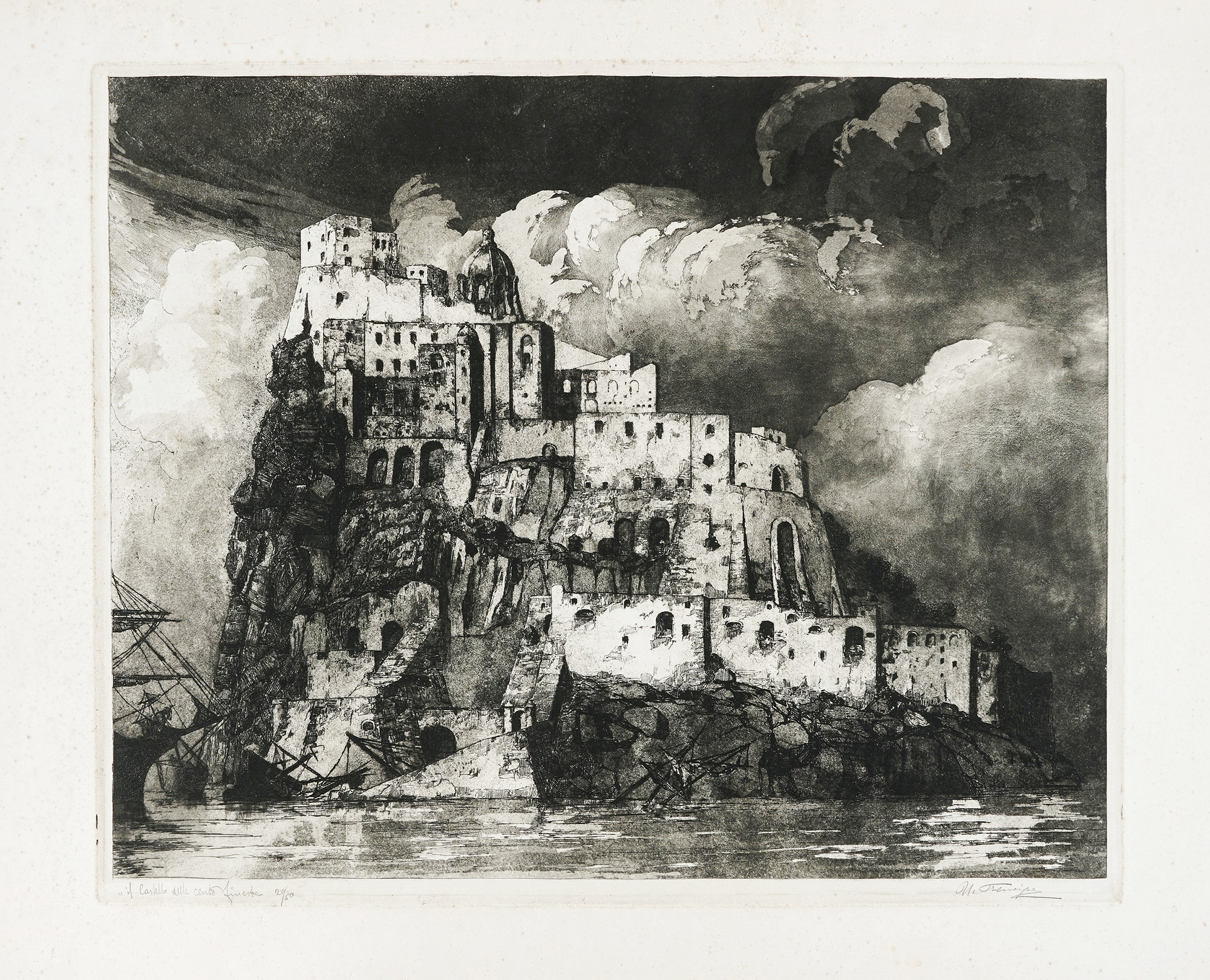 L'incisione è ispirata all'isola di Ischia e fu esposta ripetutamente nel 1914 a Roma, a Firenze e a Venezia. Rappresenta un traguardo importante nel percorso grafico dell'artista e notevole fu la fortuna espositiva dell'opera anche nei decenni successivi in Italia e all'estero. Rispetto a precedenti lavori sfumati intrisi di silenzio e di dolente misticismo crepuscolare, in questo foglio si esaltano le strutture arroccate e geometricamente compatte nella loro imponenza visionaria.