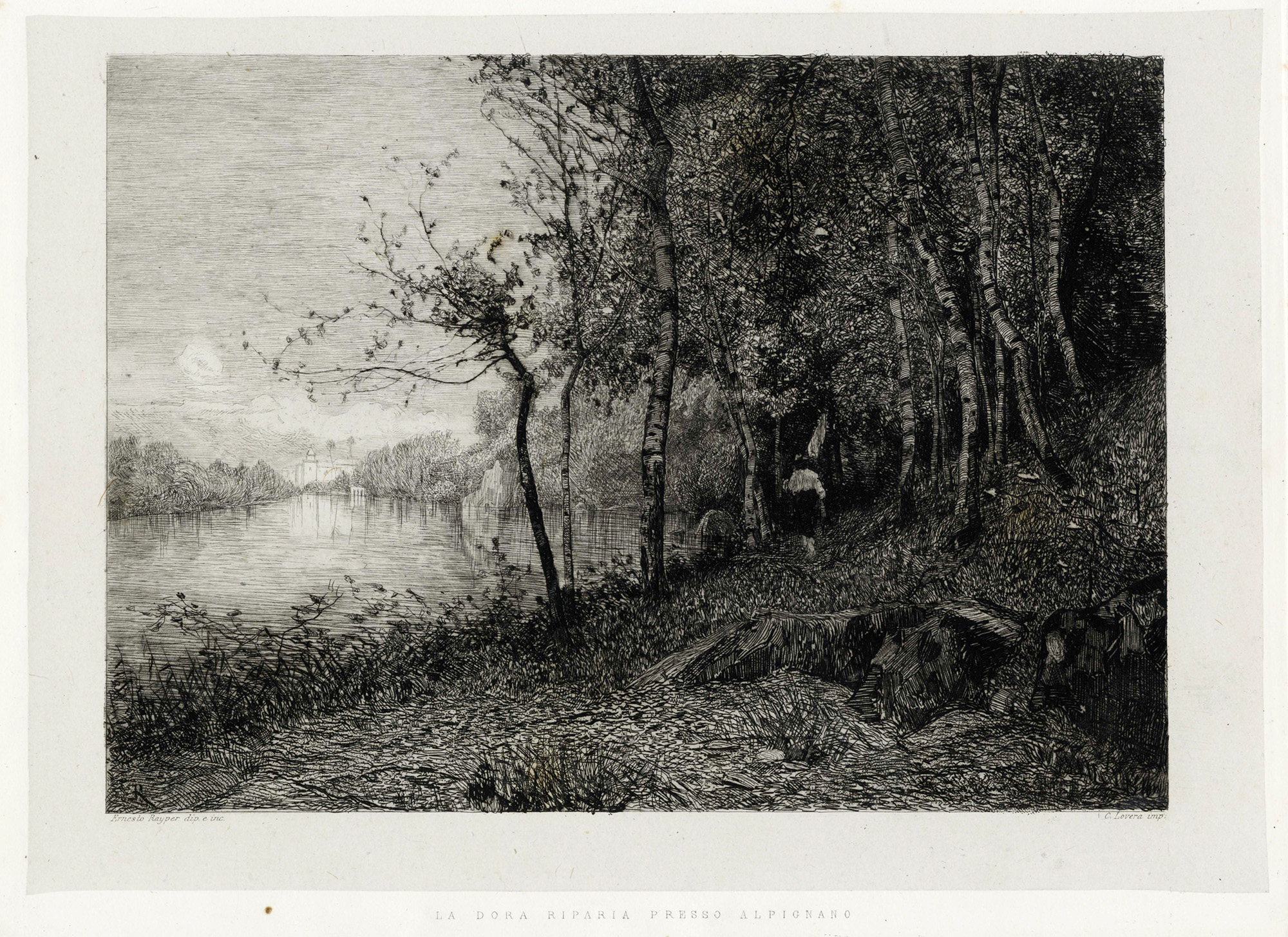 2) La Dora Riparia presso Alpignano. Acquaforte su carta applicata. mm 220x300. Foglio: mm 255x350.