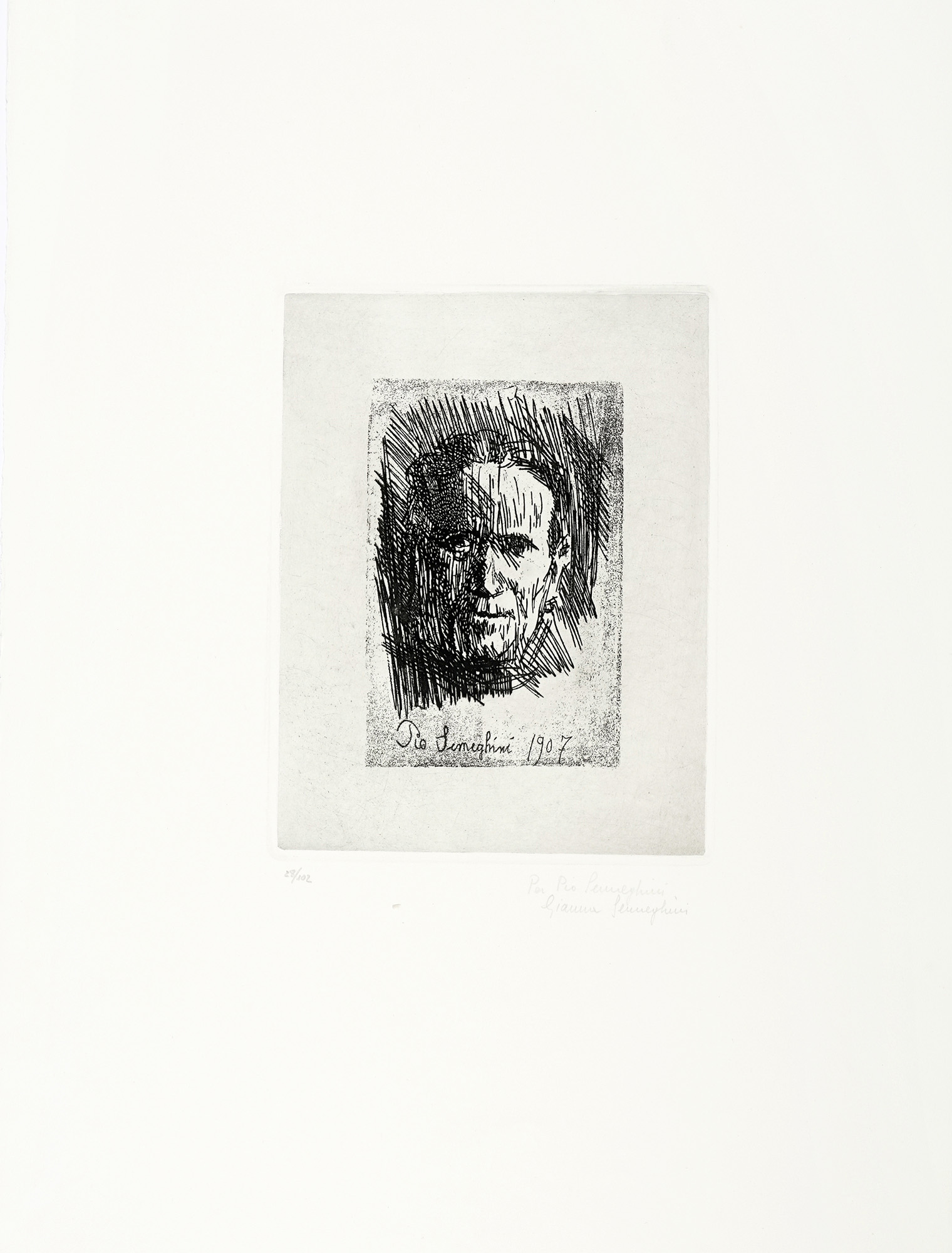 SI AGGIUNGE: 2) Semeghini G. (?), Pio Semeghini. 1907. Acquaforte. mm 280x213. Foglio: mm 640x460. Titolo e data in lastra in basso. Dedica in basso a destra: "Per Pio Semeghini, Gianni Semeghini" e tiratura a sinistra. Es. 28/102.