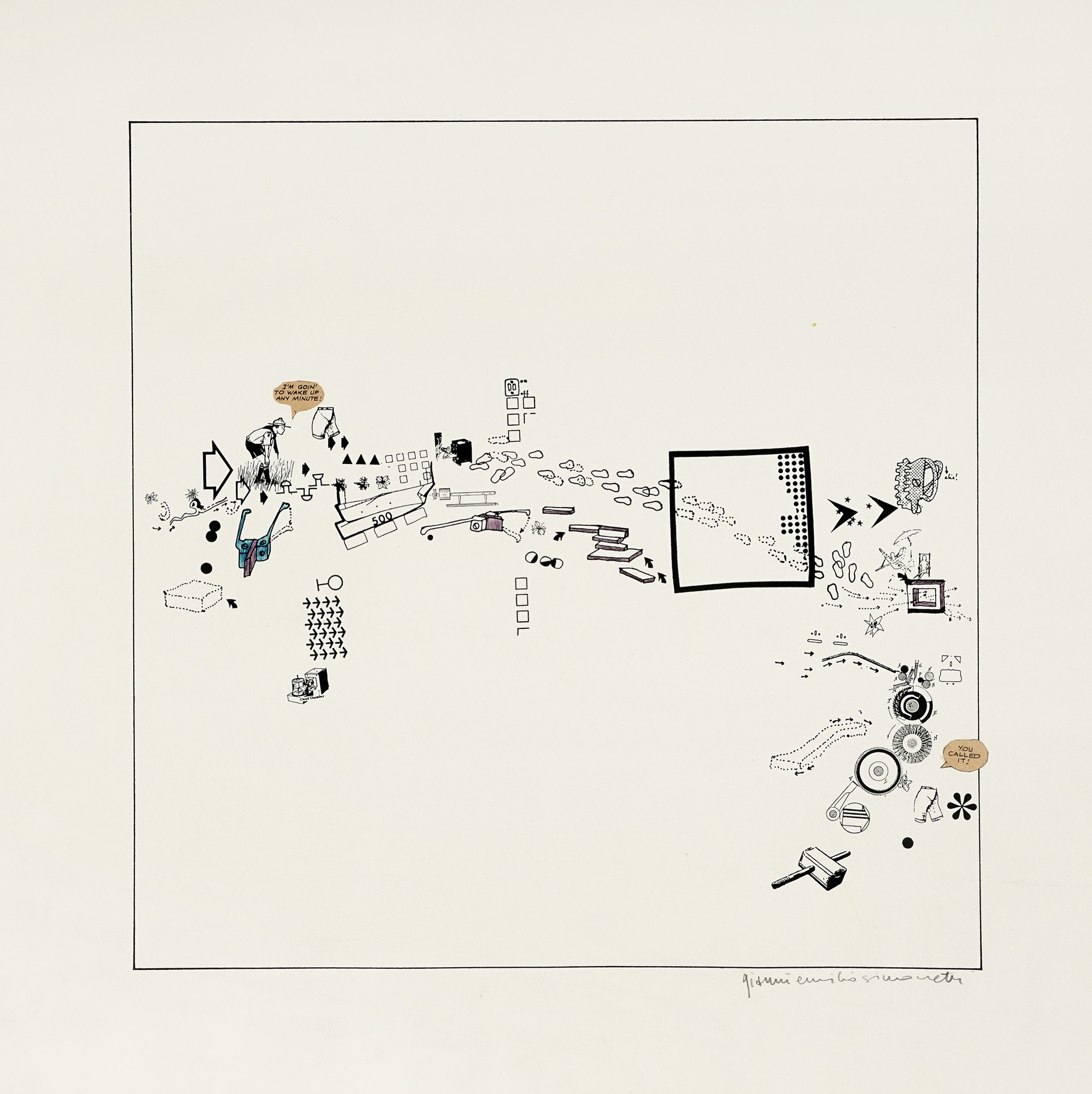 Fondo a stampa, penna e inchiostro di china, pastello e collage su carta greve