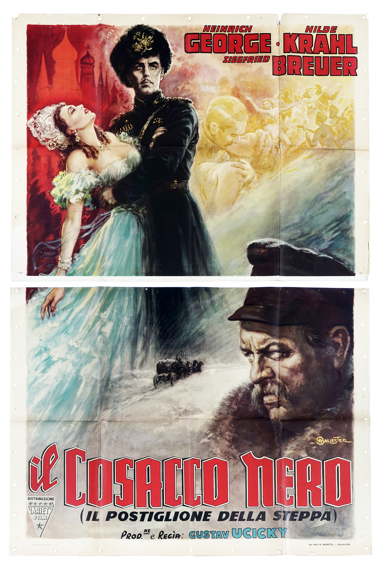 Firma, data e doppio titolo in lastra al margine inferiore destro del secondo foglio, cast e dati editoriali lungo i margini di entrambi. Poster originale del film Il postiglione della steppa diretto da Gustav Ucicky nel 1940 che nello stesso anno vinse la Coppa Mussolini al festival di Venezia come miglior film straniero.