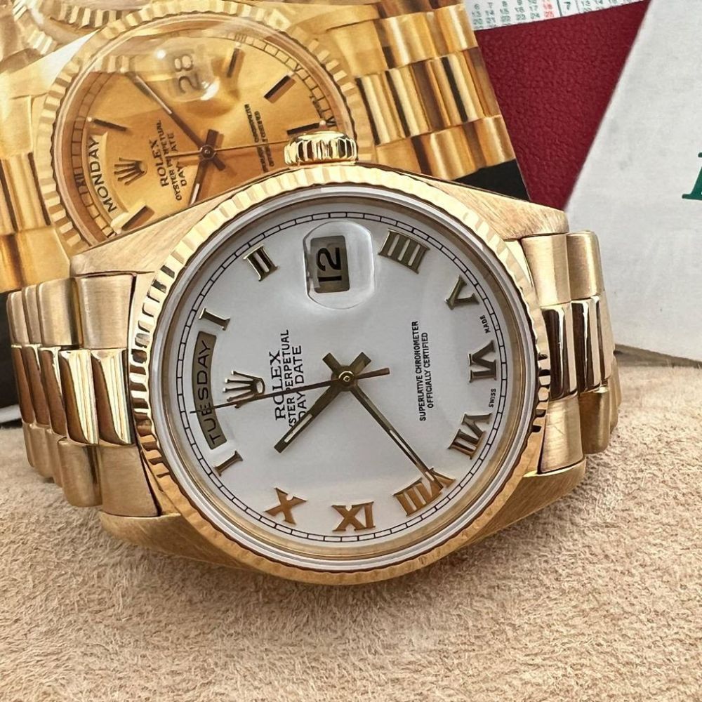 Marca Rolex Modello (Orologio) Day-Date 36 Numero di referenza 18238 Carica Automatico Materiale della cassa Oro giallo Materiale cinturino Oro giallo Anno di produzione 1997 garanzia Rolex, no box Materiale della cassa Oro giallo Diametro 36 mm Impermeabile 10 ATM Materiale lunetta Oro giallo Vetro Vetro zaffiro Cinturino Materiale cinturino Oro giallo Colore cinturino Oro Materiale chiusura Oro giallo