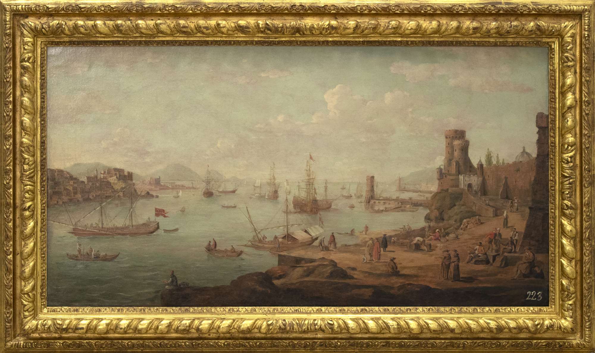 Hendrik Frans Van Lint (Anversa 1684 – Roma 1763), Veduta di porto, XVIII secolo, olio su tela, cm 57x110