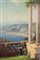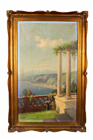 OLIO SU TELA raffigurante scorcio di Taormina con l'Etna a firma Vincenzo Udine Palermo 1898-1981 h cm 100 x 60 / cornice h cm 116,5 x 76,5