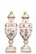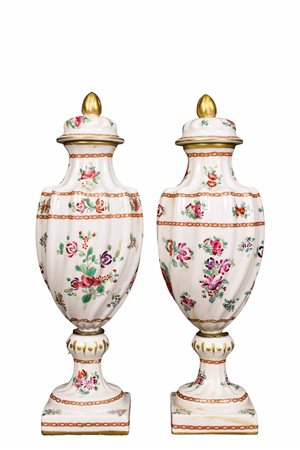 COPPIA DI VASI CON COPERCHI in porcellana decorata a motivi floreali e lumeggiature in oro manifattura tedesca XX secolo h cm 30 x 9