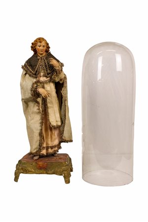 SCULTURA DA PRESEPE con testa e arti in terracotta dipinta abiti in stoffa con base in legno e campana in vetro adattata maestranze napoletane XVIII/XIX secolo h cm 44,5 x 15 x 15