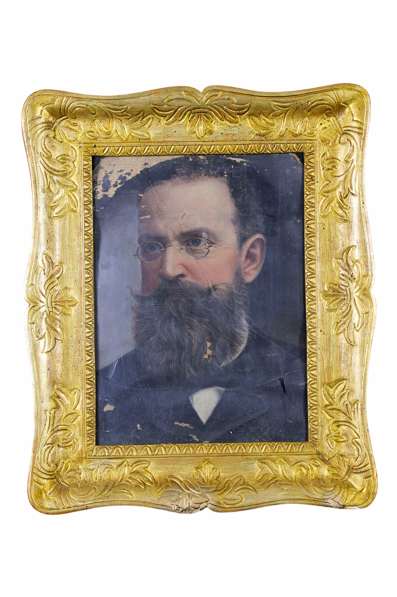 OLIO SU TELA raffigurante volto di nobil uomo dentro cornice a guantiera in legno dorato arricchito da incisioni, difetti alla tela e usure del tempo Sicilia primi 900 h cm 46 x 34 / cornice h cm 67 x 55