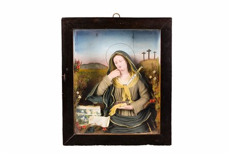 PREGIATO GRUPPO SCULTOREO in cera raffigurante la Madonna addolorata arricchita da tralci fioriti dentro teca in legno ebanizzato e dipinta all'interno raffigurante il Monte Calvario Sicilia XVIII secolo h cm 18 x 10 / teca h cm 29 x 24,5 x 6