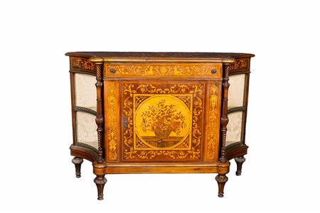 ELEGANTE ETAGERE SCANTONATA a uno sportello e un cassetto in legno di noce riccamente intarsiata in varie essenze di legno maestranze italiane XIX secolo h cm 102 x 148 x 48