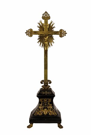CROCIFISSO in ottone finemente scolpito e cesellato base in legno ebanizzato con applicazioni in metallo dorato e piedi leonini Sicilia XIX secolo h cm 59,5 x 19 x 12