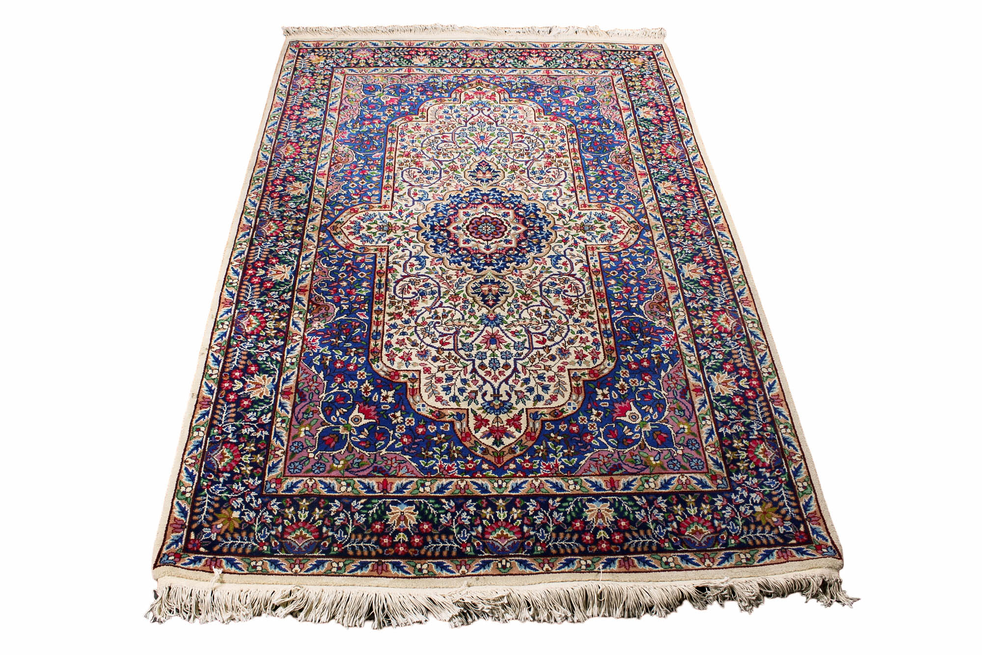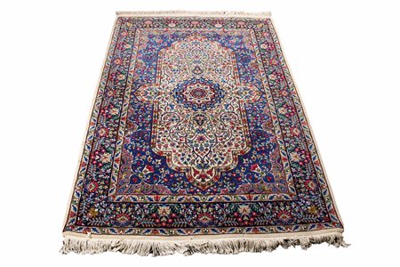 TAPPETO BERKANA annodato a mano con particolare decorazione floreale su fondo blu Cina XX secolo cm 219 x 139