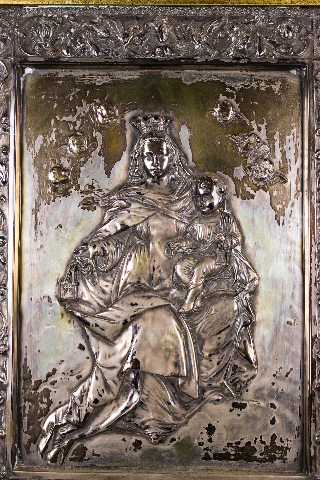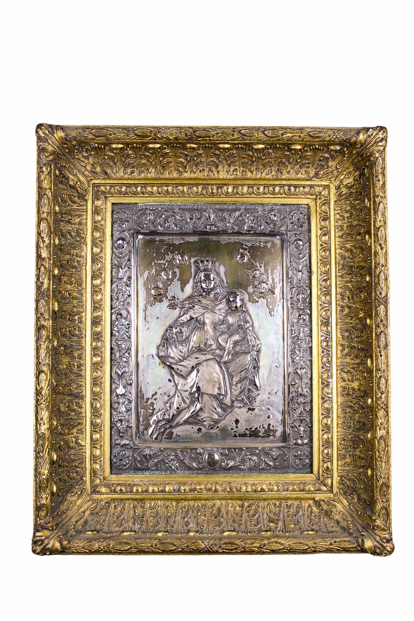 BELLA PLACCA in metallo sbalzato finemente cesellato e argentato raffigurante la madonna e il bambino attorniato da angeli dentro cornice in legno intagliato e pastiglia dorata maestranze siciliane XIX secolo h cm 39 x 29 / cornice h cm 60 x 50