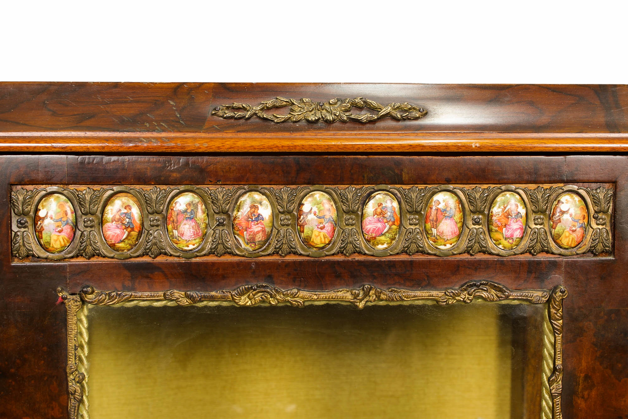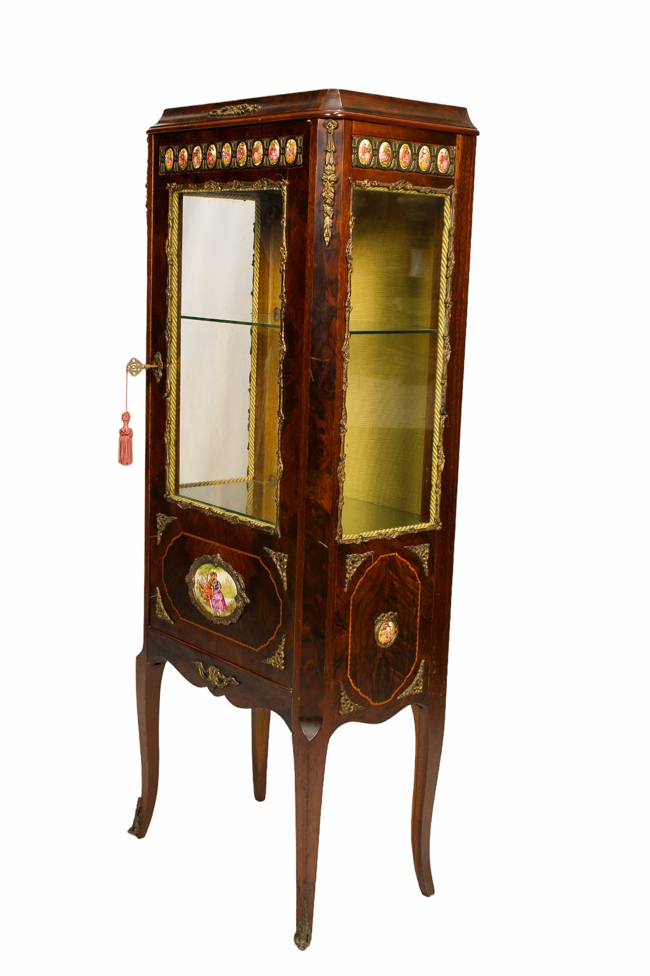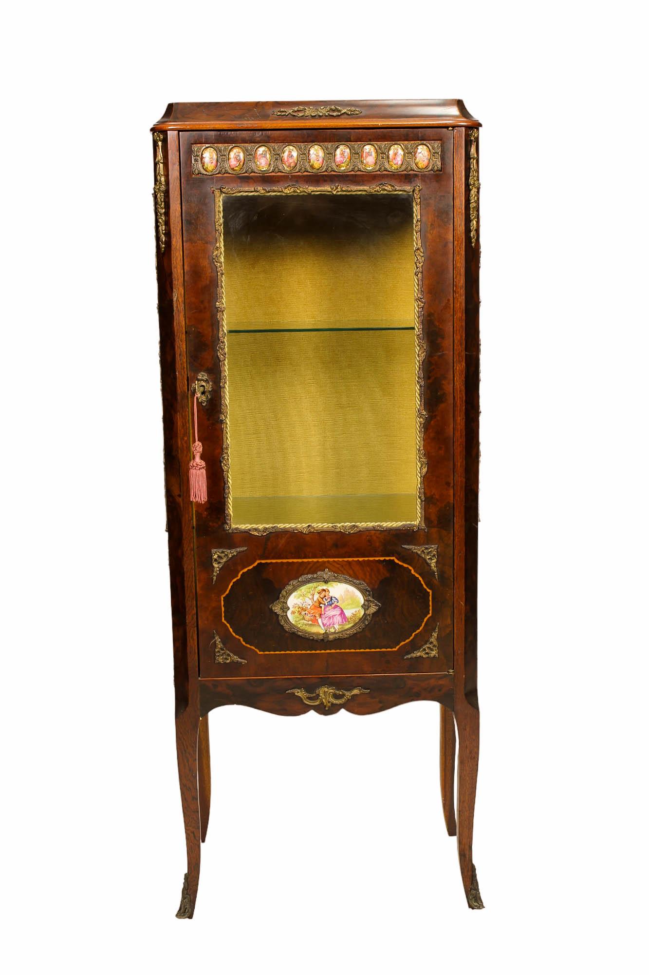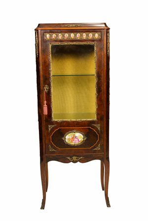 PICCOLA VETRINA AD UN ANTA in varie essenze di legno con applicazioni in metallo dorato e placche in porcellana dipinte da varie raffigurazioni Francia XX secolo h cm 132 x 51 x 30