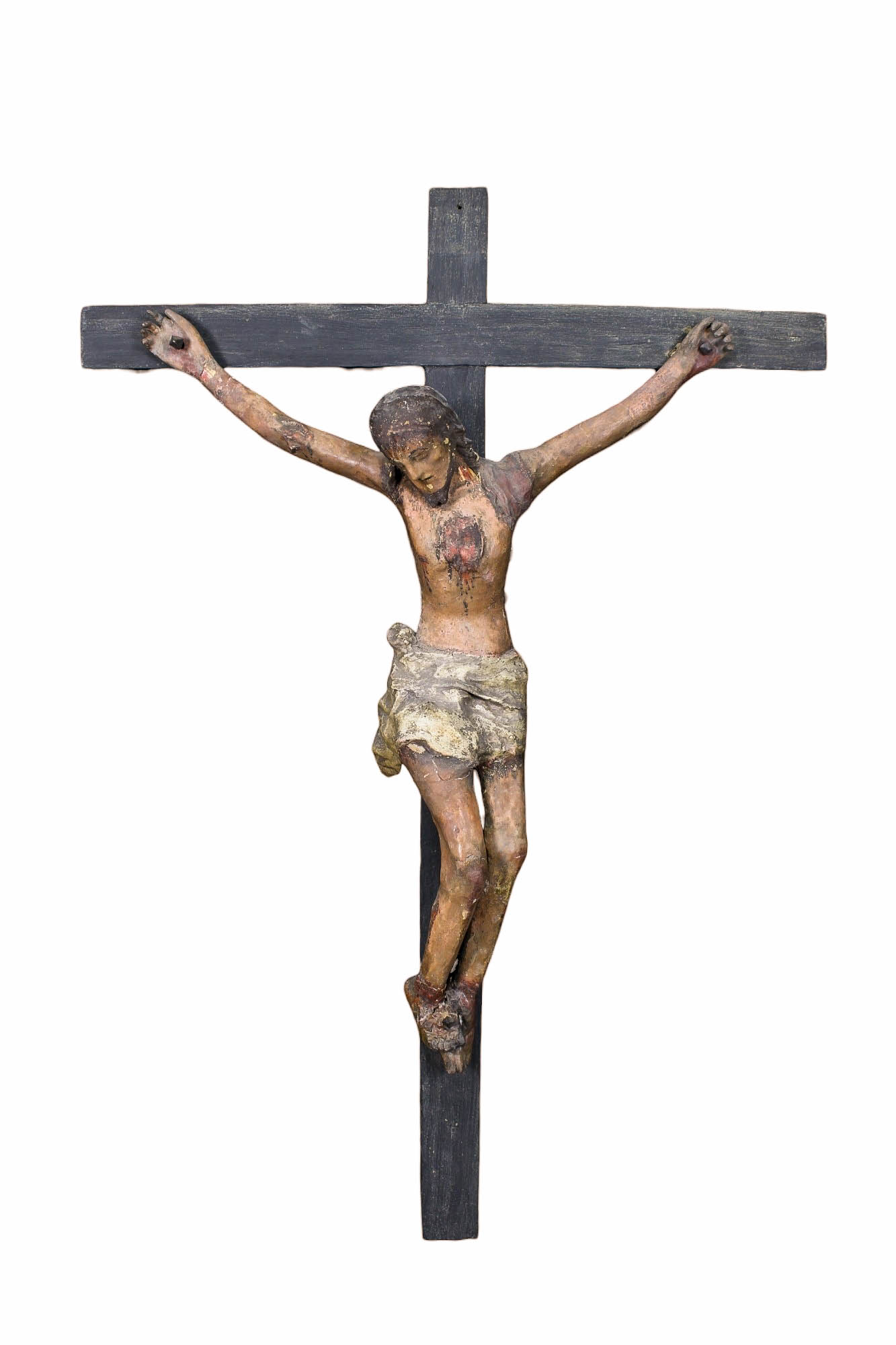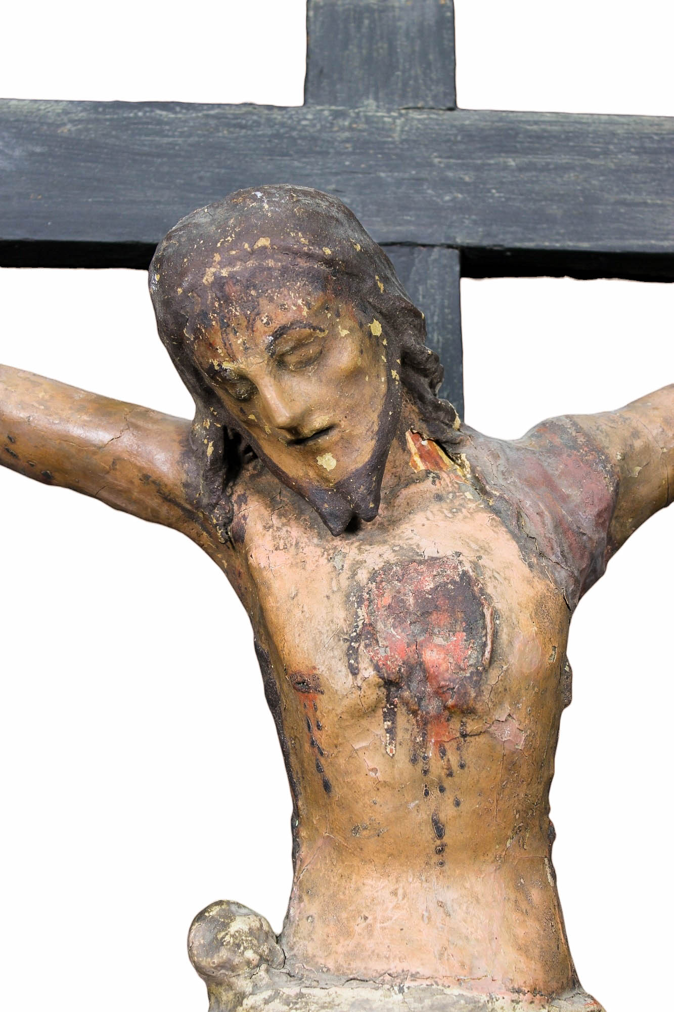 IMPORTANTE CROCIFISSO in cartapesta dipinta con croce in legno ebanizzato usure del tempo e vecchi restauri manifattura siciliana XVIII/XIX secolo h cm 130 x 90 x 18