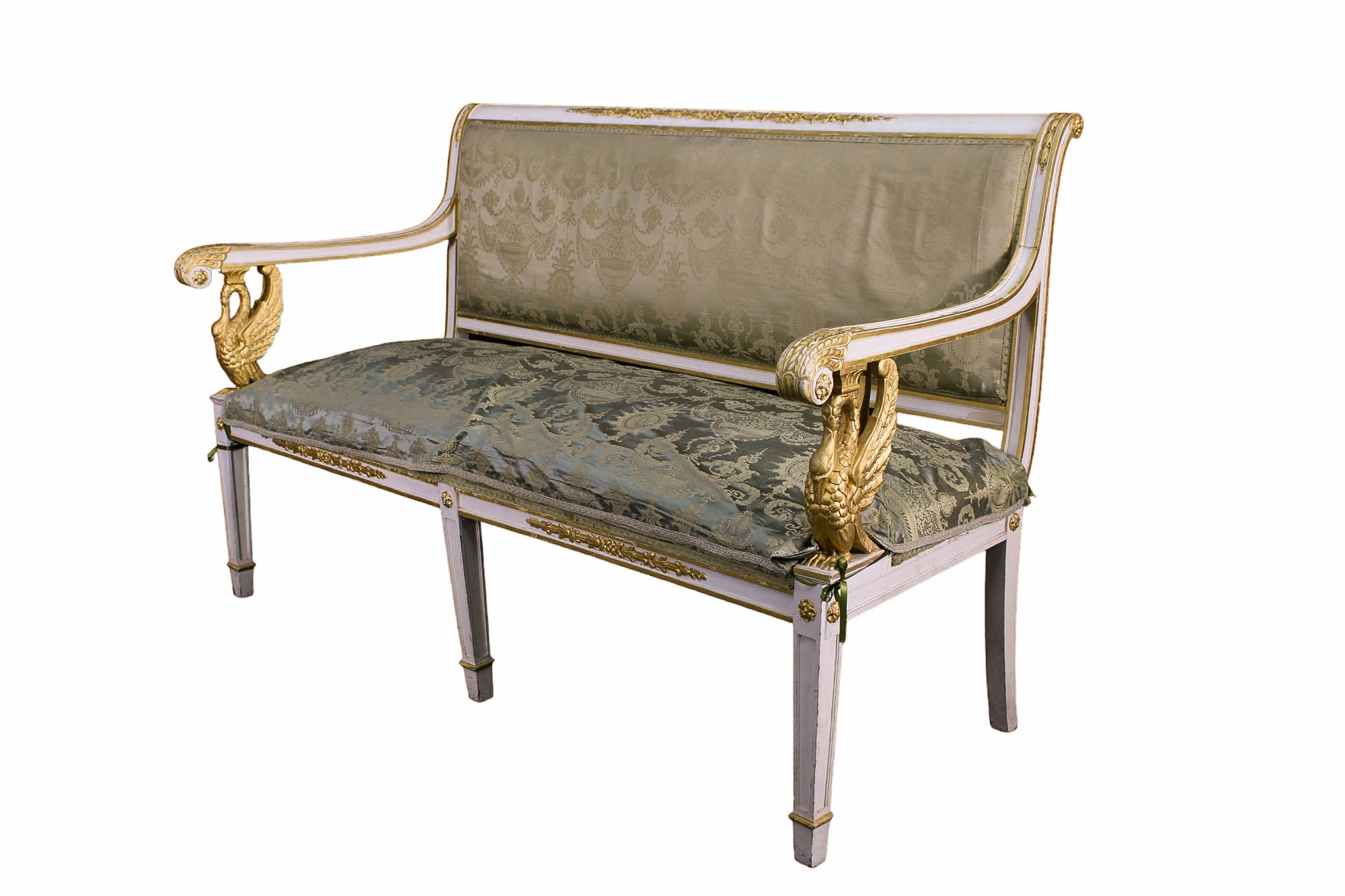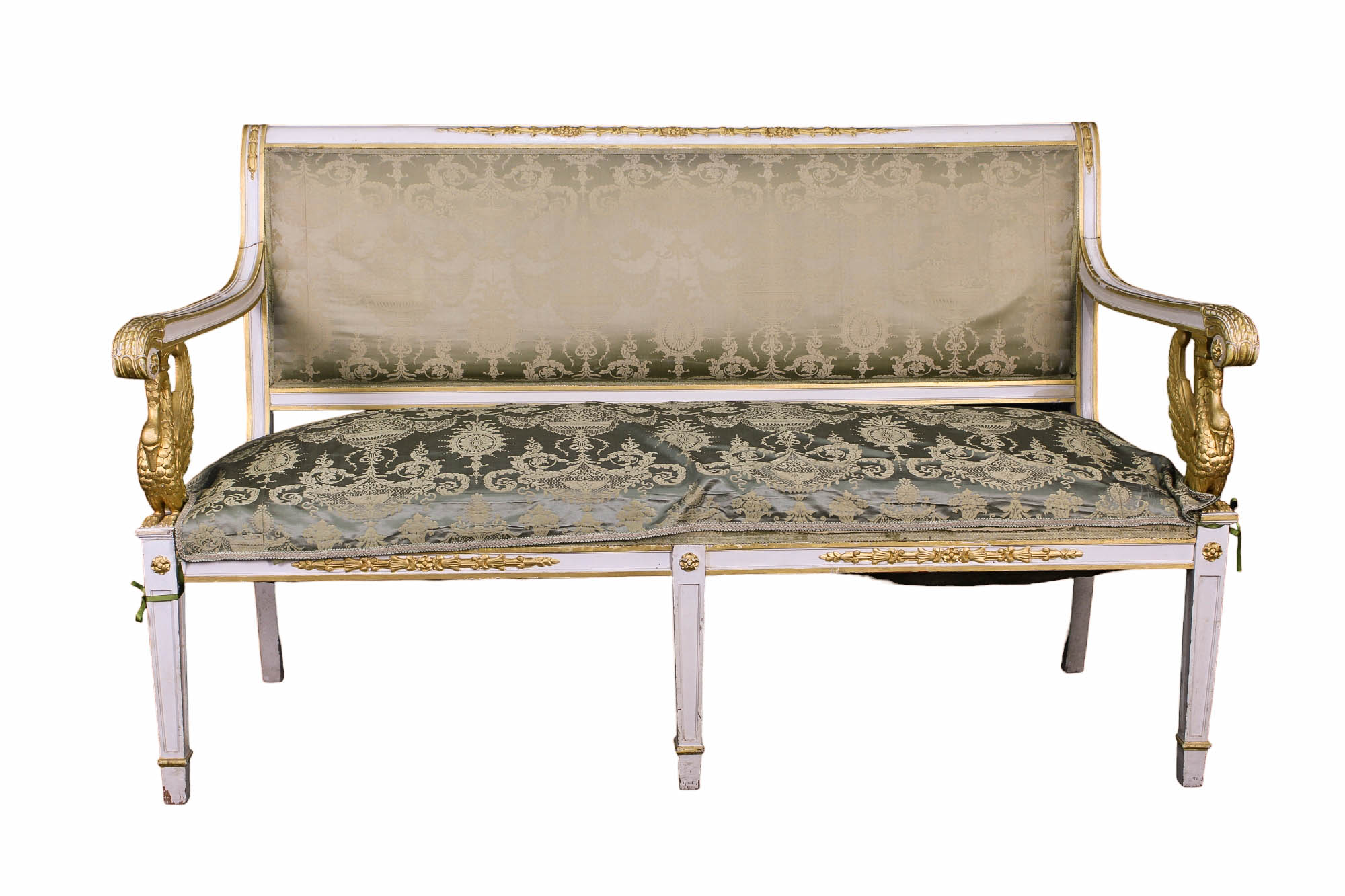 DIVANO DI GUSTO NEOCLASSICO in legno scolpito dorato e laccato raffigurante cigni manifattura siciliana fine XIX secolo h cm 100 x 162 x 60