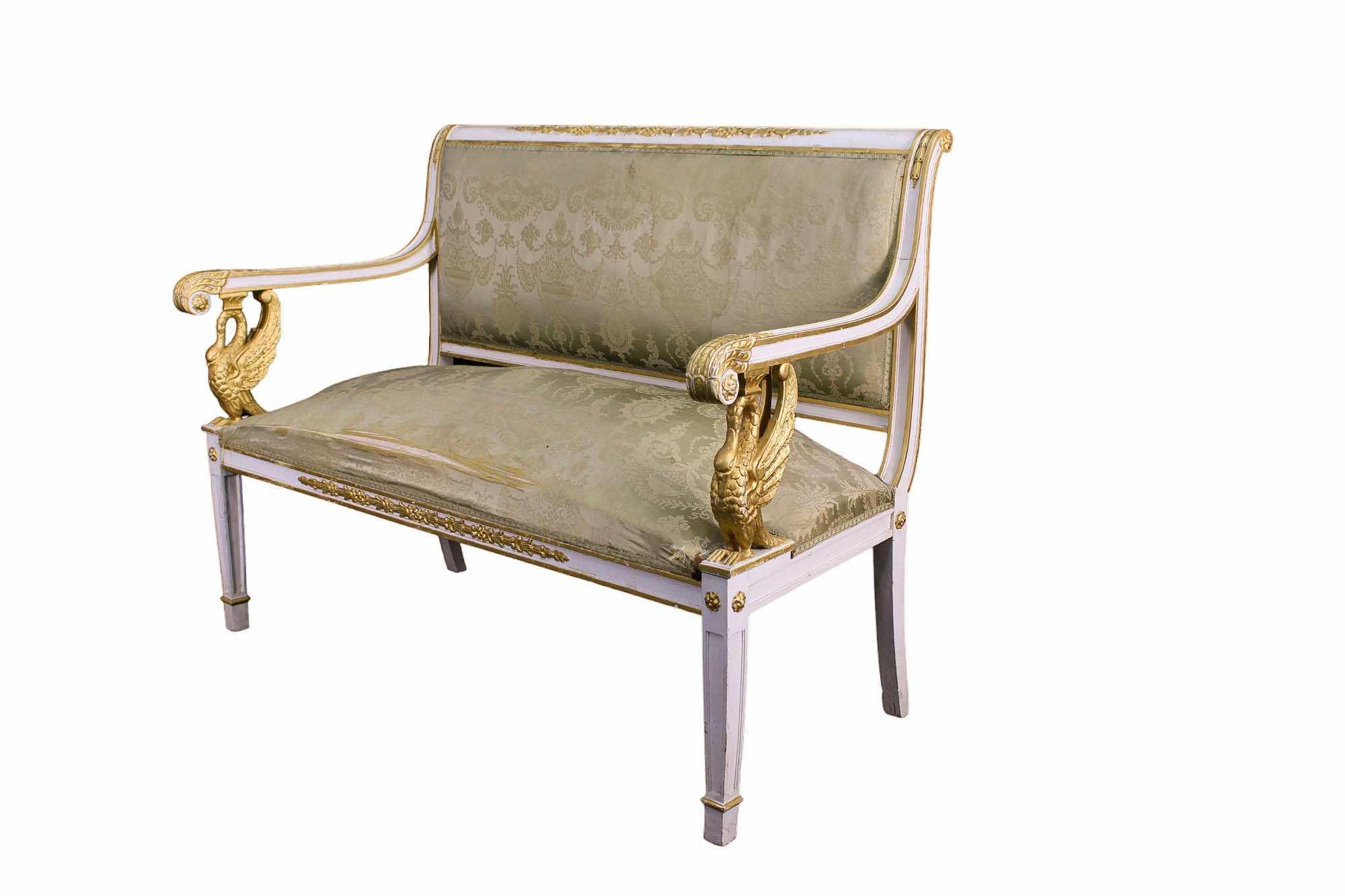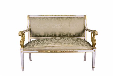 DIVANO DI GUSTO NEOCLASSICO in legno scolpito dorato e laccato raffigurante cigni manifattura siciliana fine XIX secolo h cm 100 x 135 x 57