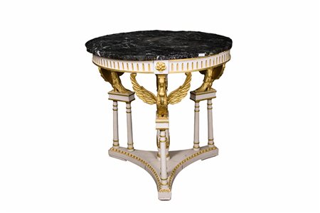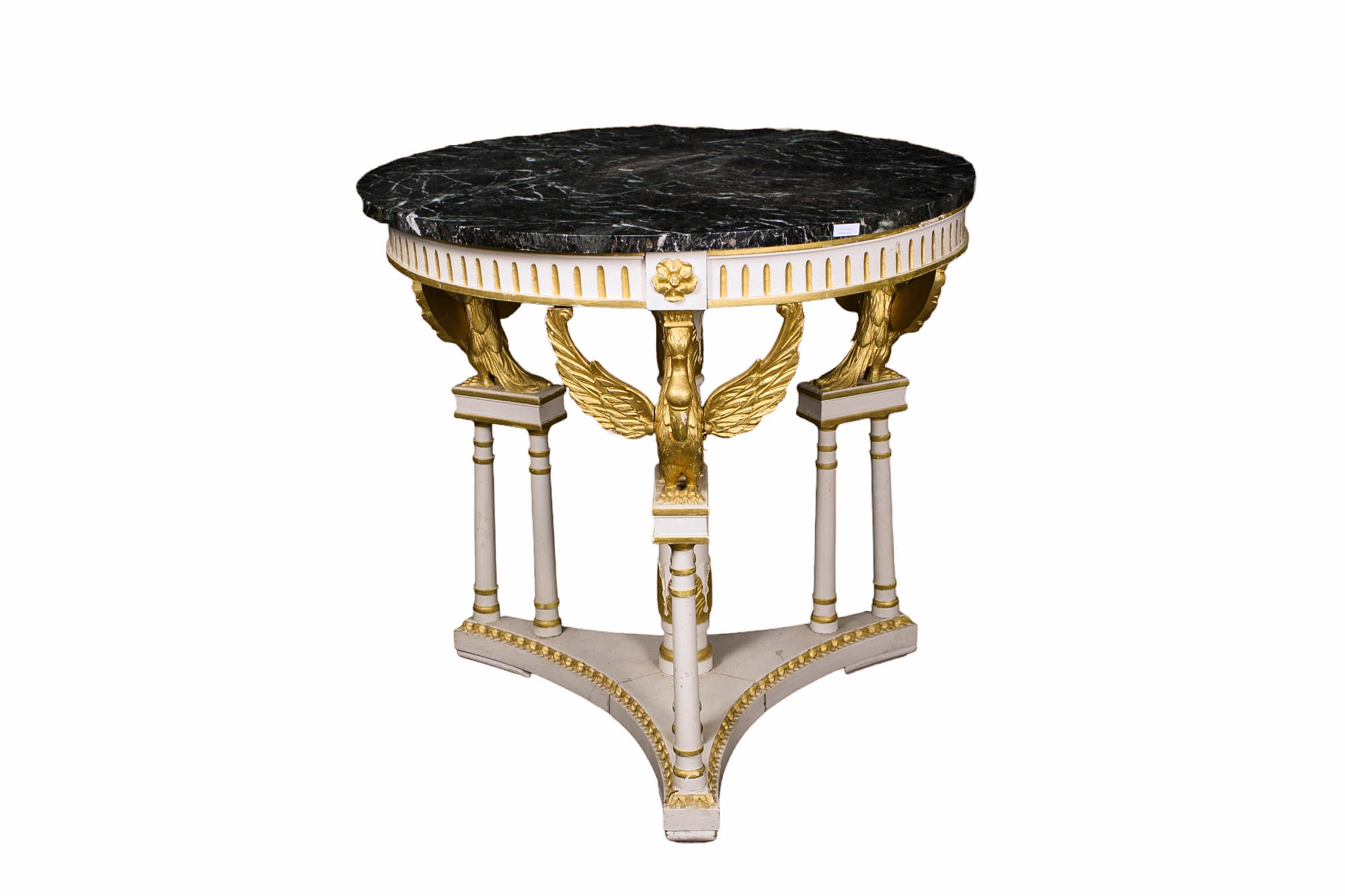TAVOLINO DI GUSTO NEOCLASSICO in legno scolpito laccato e dorato raffigurante cigni con piano in marmo manifattura siciliana fine XIX secolo h cm 81 x 33