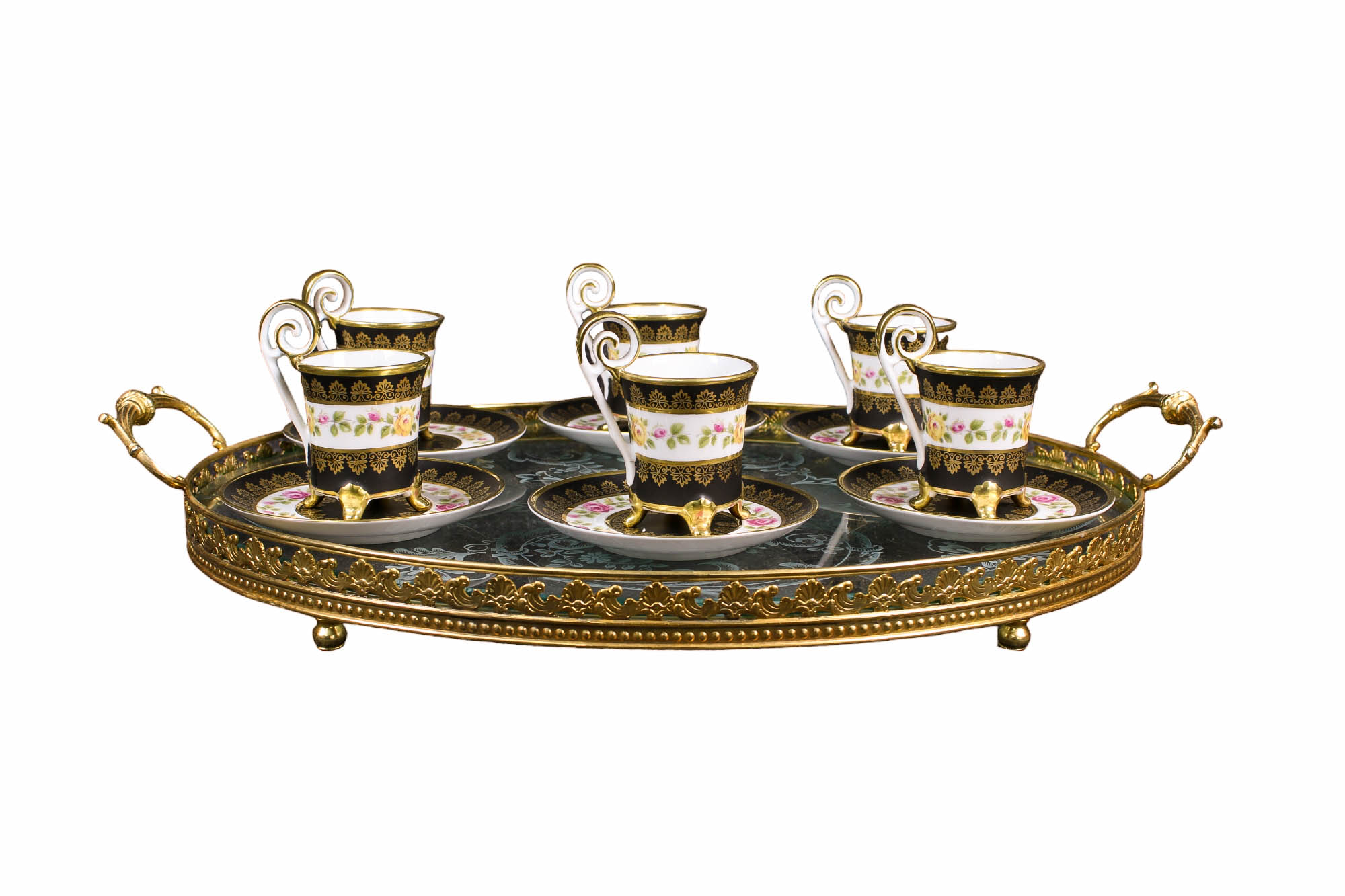 LOTTO COMPOSTO DA 6 tazzine in porcellana dipinta con lumeggiature in oro manifattura Vieux Paris e vassoio in metallo dorato e vetro inciso Francia XX secolo misure varie