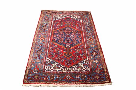 TAPPETO PERSIANO in vello e lana annodato a mano fondo rosso e blu XX secolo cm 196 x 125