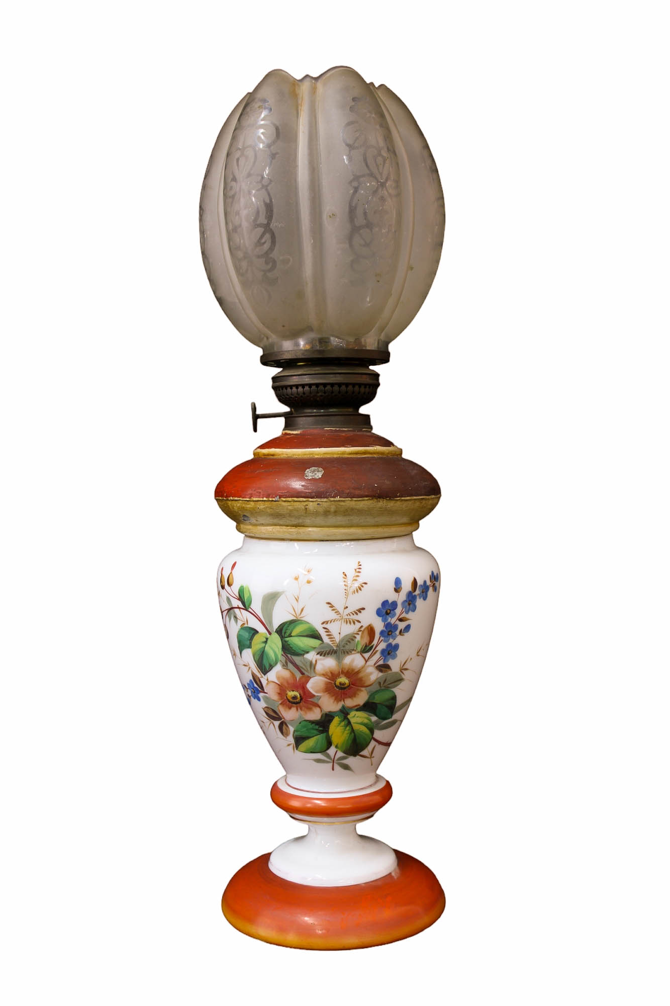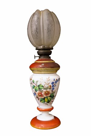 LUME in opaline dipinto a motivi floreali e boccia in vetro satinato, restauri Sicilia fine 800 primi 900 h cm 57 x 15