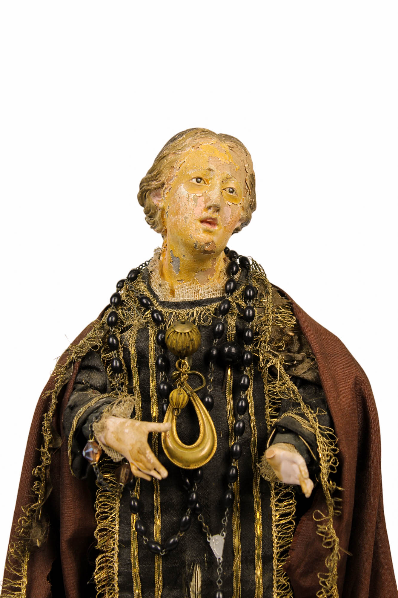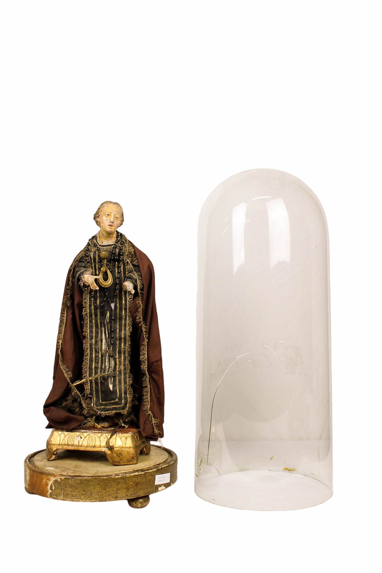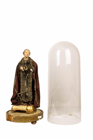 SCULTURA raffigurante Santa con arti e testa in legno abiti in seta con applicazioni di oggetti votivi , poggia su base in legno scolpito e dorato dentro campana in vetro (rottura) Napoli XVIII secolo h cm 58 x 25 / h cm 41 x 16