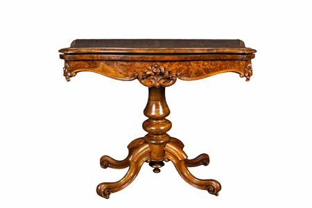 TAVOLINO DA GIOCO in noce e radica di noce a piede centrale e piano ribaltabile Inghilterra XIX secolo h cm 75 x 93 x 45 / aperto h cm 72 x 93 x 93