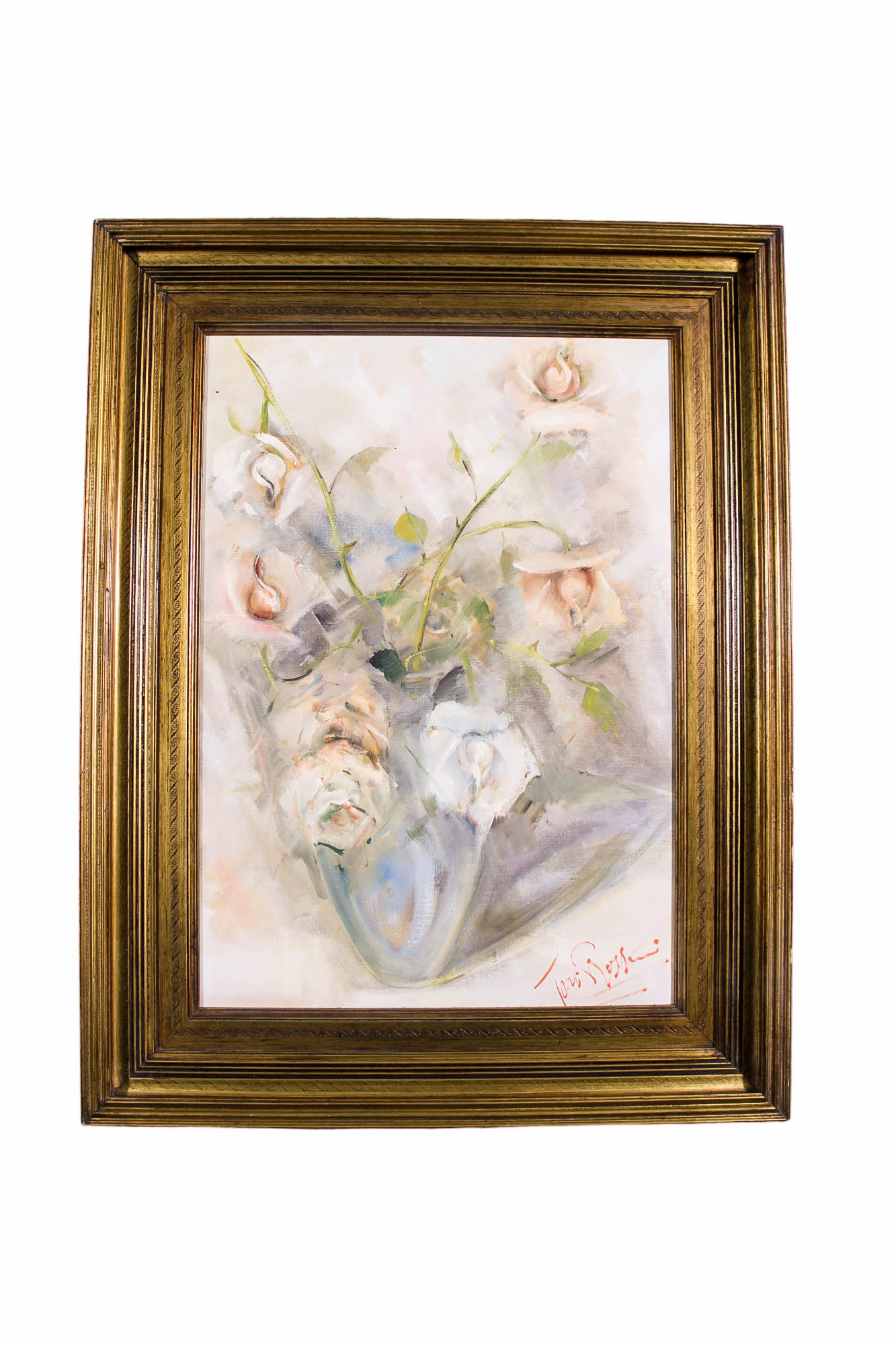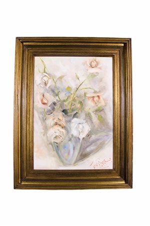 OLIO SU TELA raffigurante vaso con fiori dentro cornice in legno dorato a firma Toni Rossini Italia XX secolo h cm 90 x 70