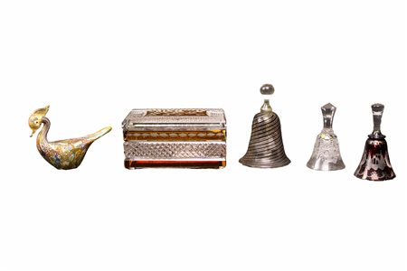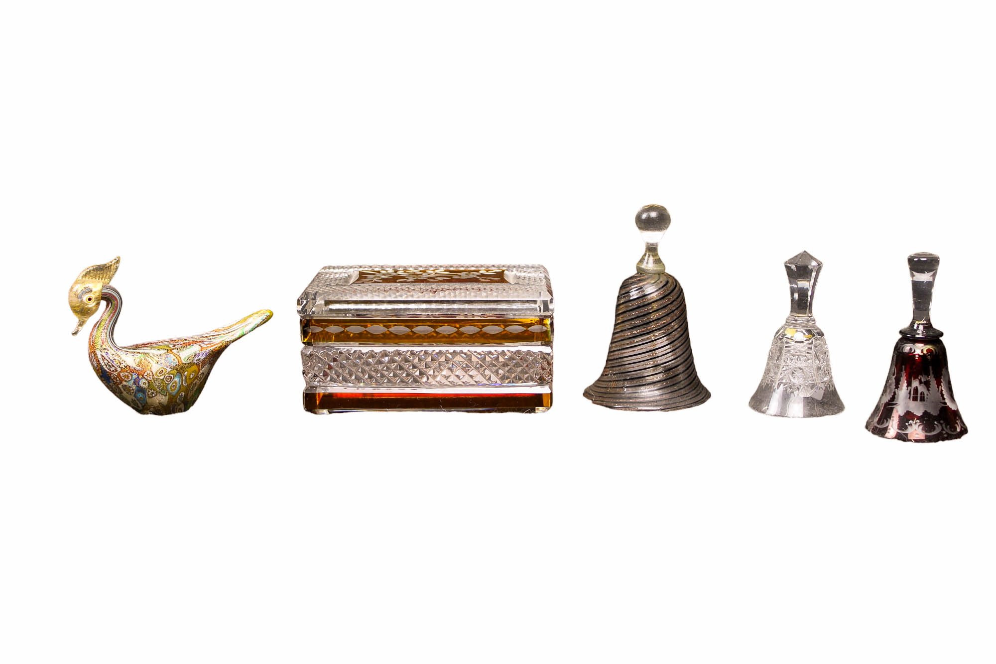 LOTTO COMPOSTO DA 1 scatola in cristallo intagliato 3 campanelle in vetro e 1 animale in vetro di Murano diverse manifatture XX secolo misure varie