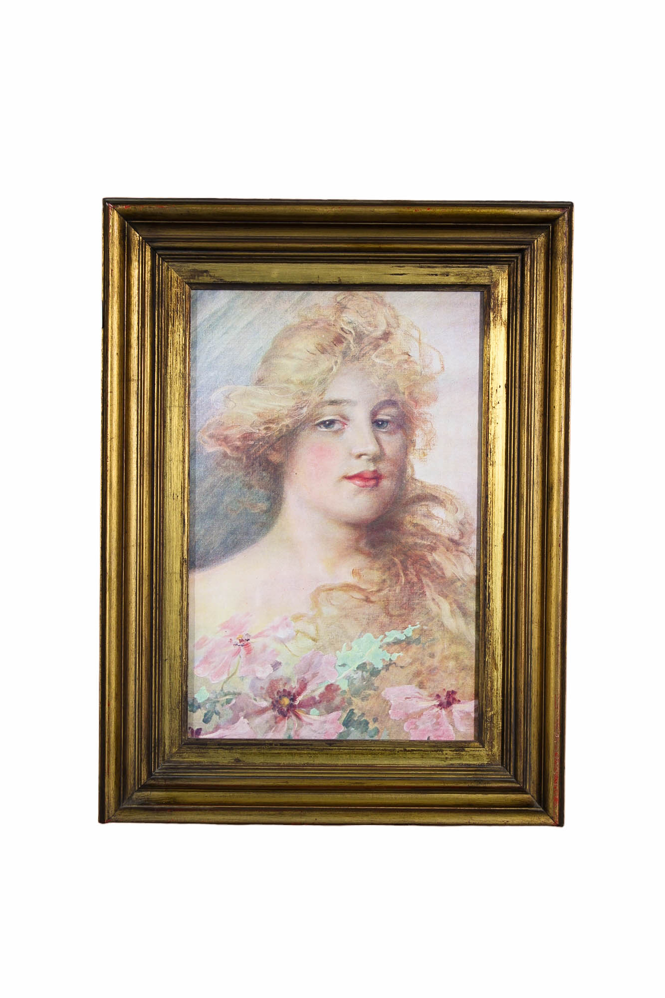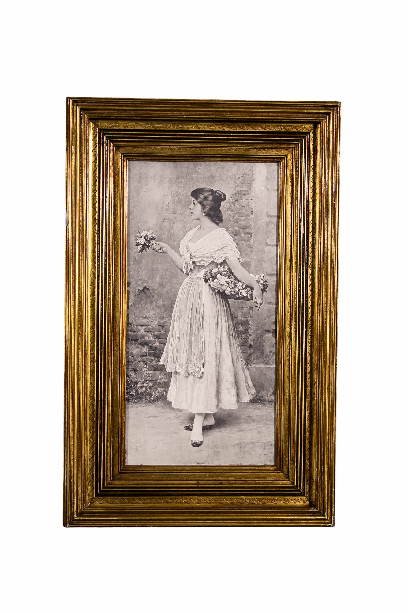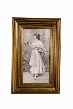 LOTTO COMPOSTO DA 1 acquerello su carta raffigurante figura femminile dentro cornice in legno dorato e 1 stampa raffigurante la fioraia dentro cornice in legno dorato scuola Italiana XX secolo h cm 58 x 44 / h cm 66 x 42,5